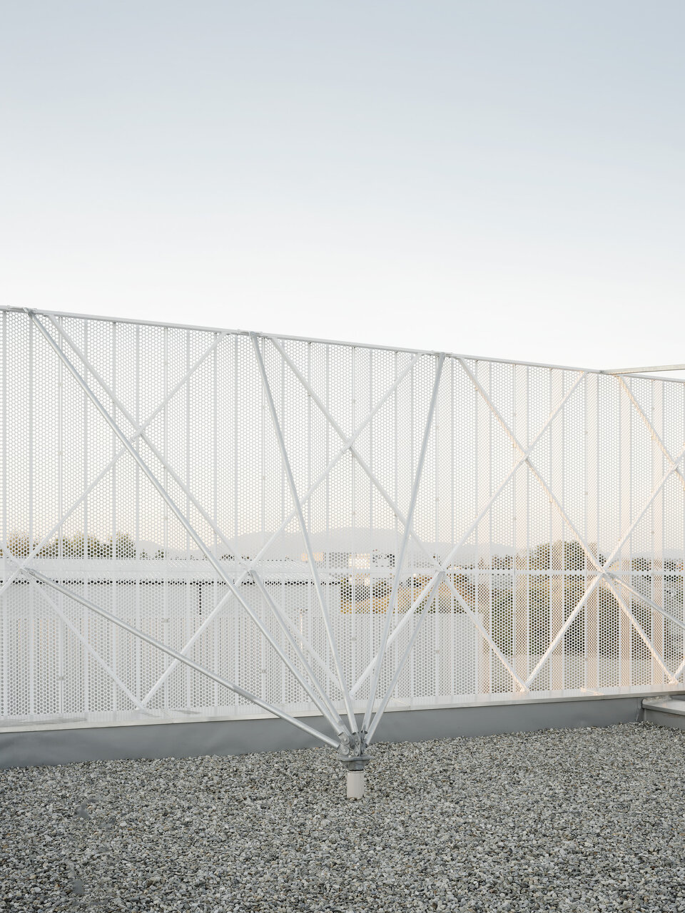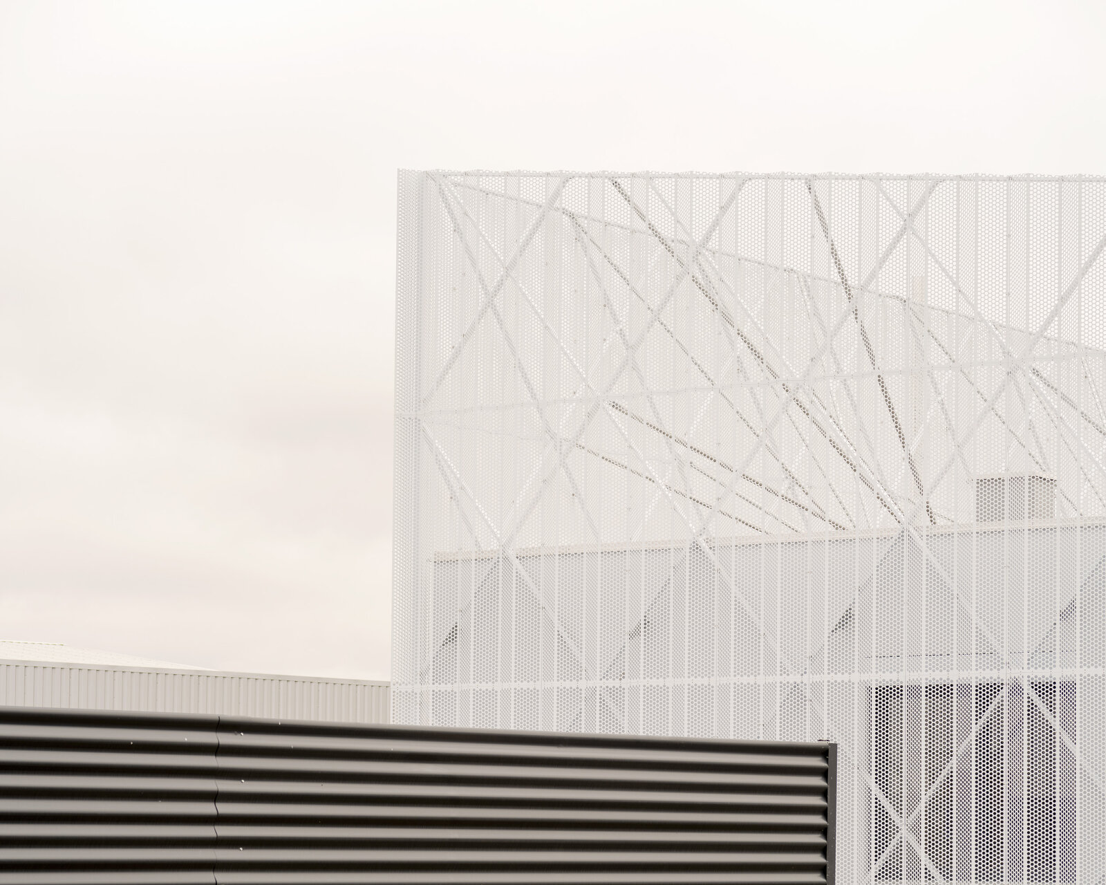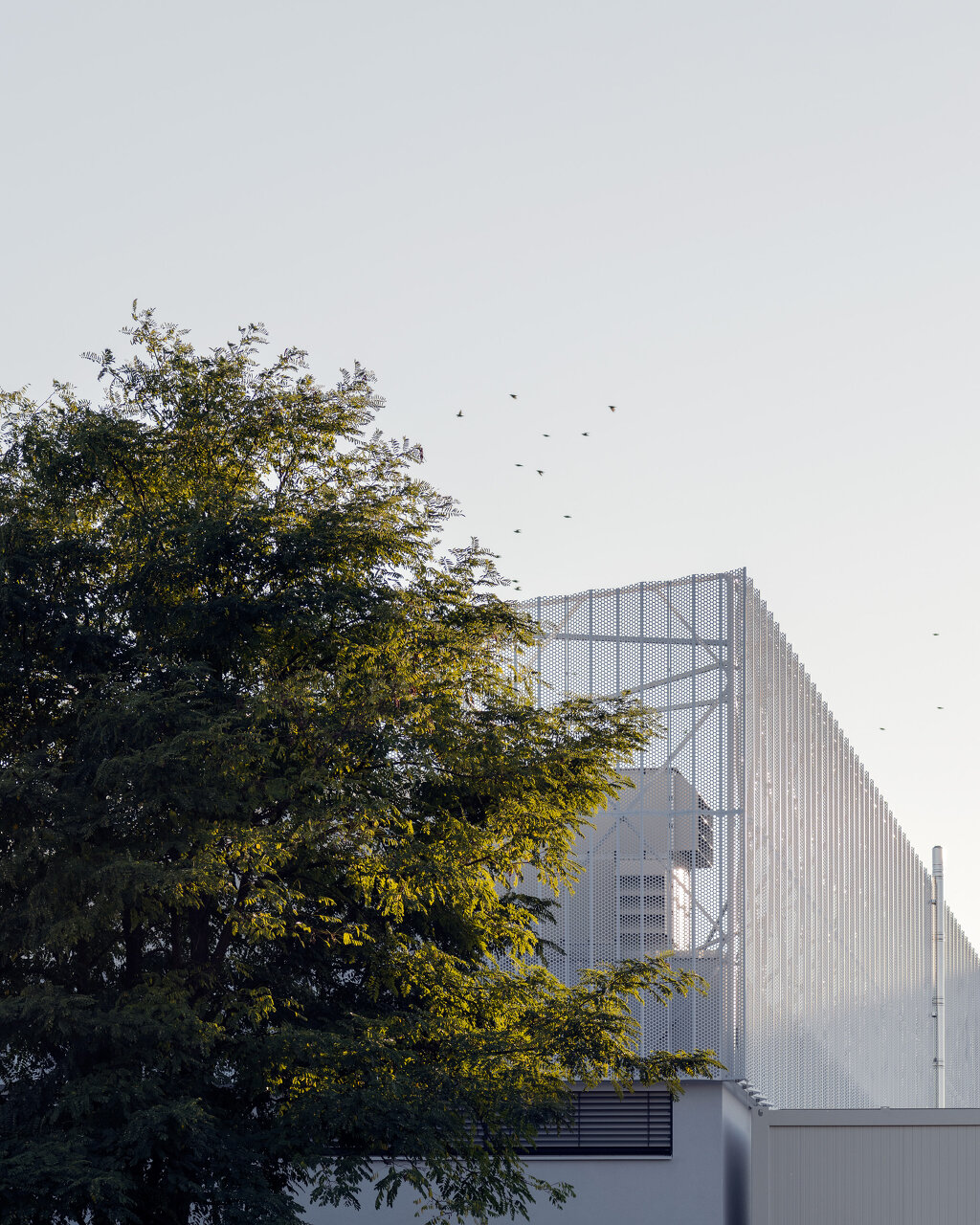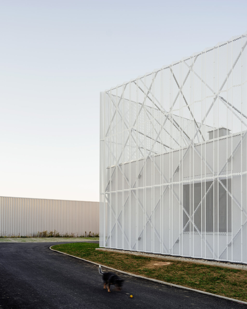Wie eine Voliere umhüllt die aufsteigende transluzente Fassade aus dreidimensional gefaltetem, großformatigem Lochblech, welches zusammen mit der rautenförmigen Unterkonstruktion ein komplexes Spiel aus Licht und Schatten erzeugt, das gesamte im Süden ein- und im Norden zweigeschossige Gebäude. Dieser schimmernde Metallkäfig verhindert einerseits ein „Ausbüxen“ der vierbeinigen Patienten aus Fenstern und Atrien und dient zugleich als Blickfilter für die am Dach befindlichen Klimageräte und Photovoltaikanlage. Darüber hinaus verleiht er dem Baukörper seine signifikante Figur. (Text: Architekt)