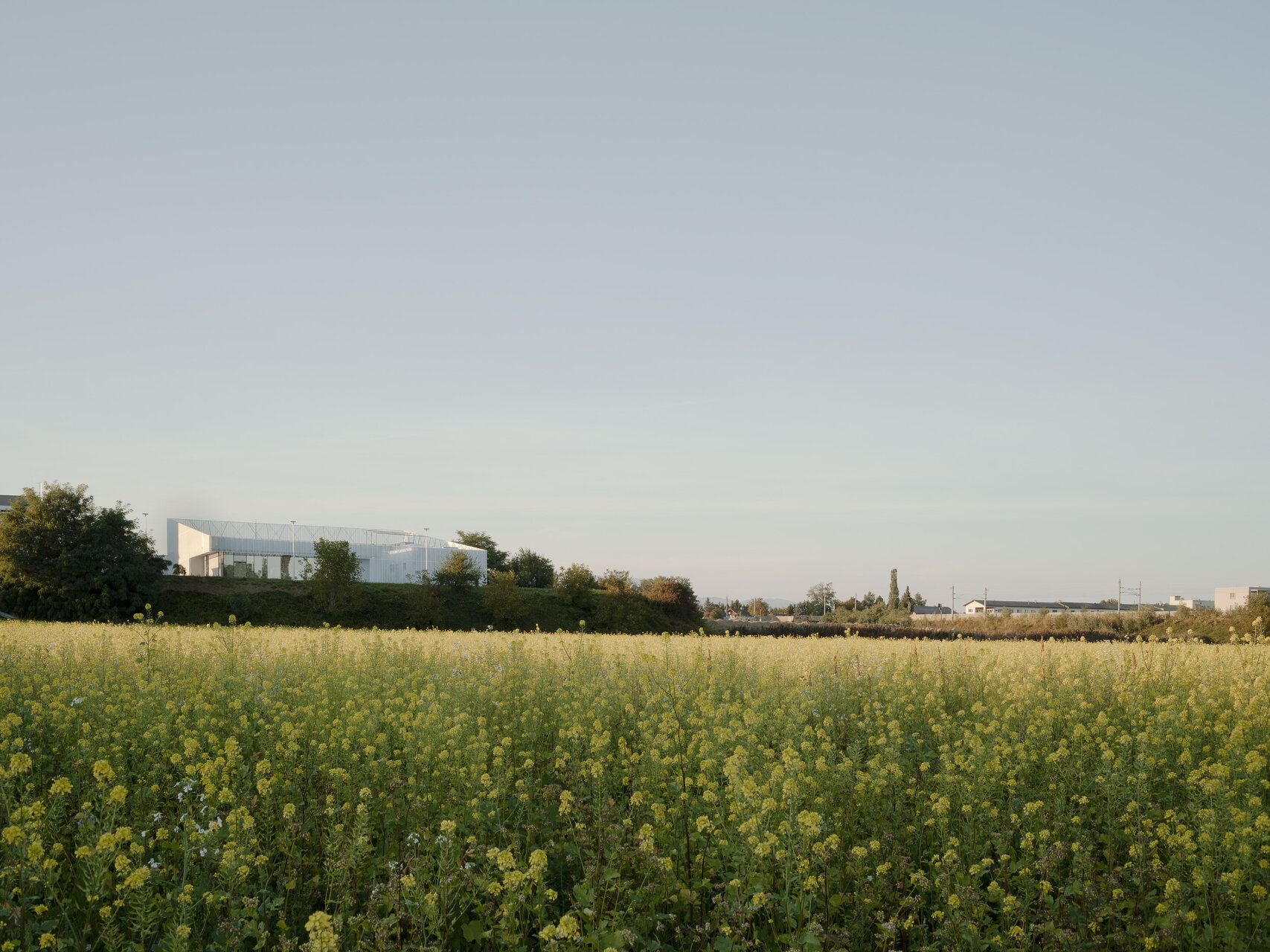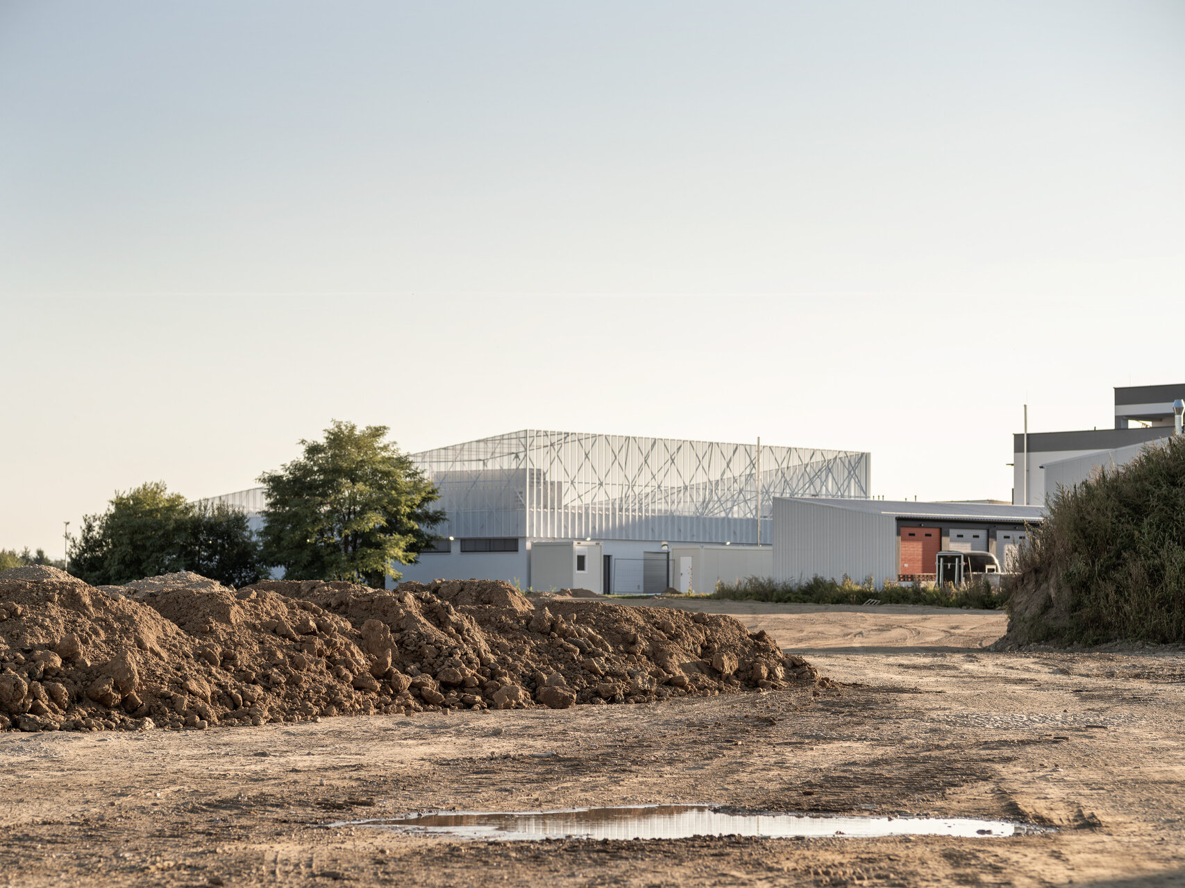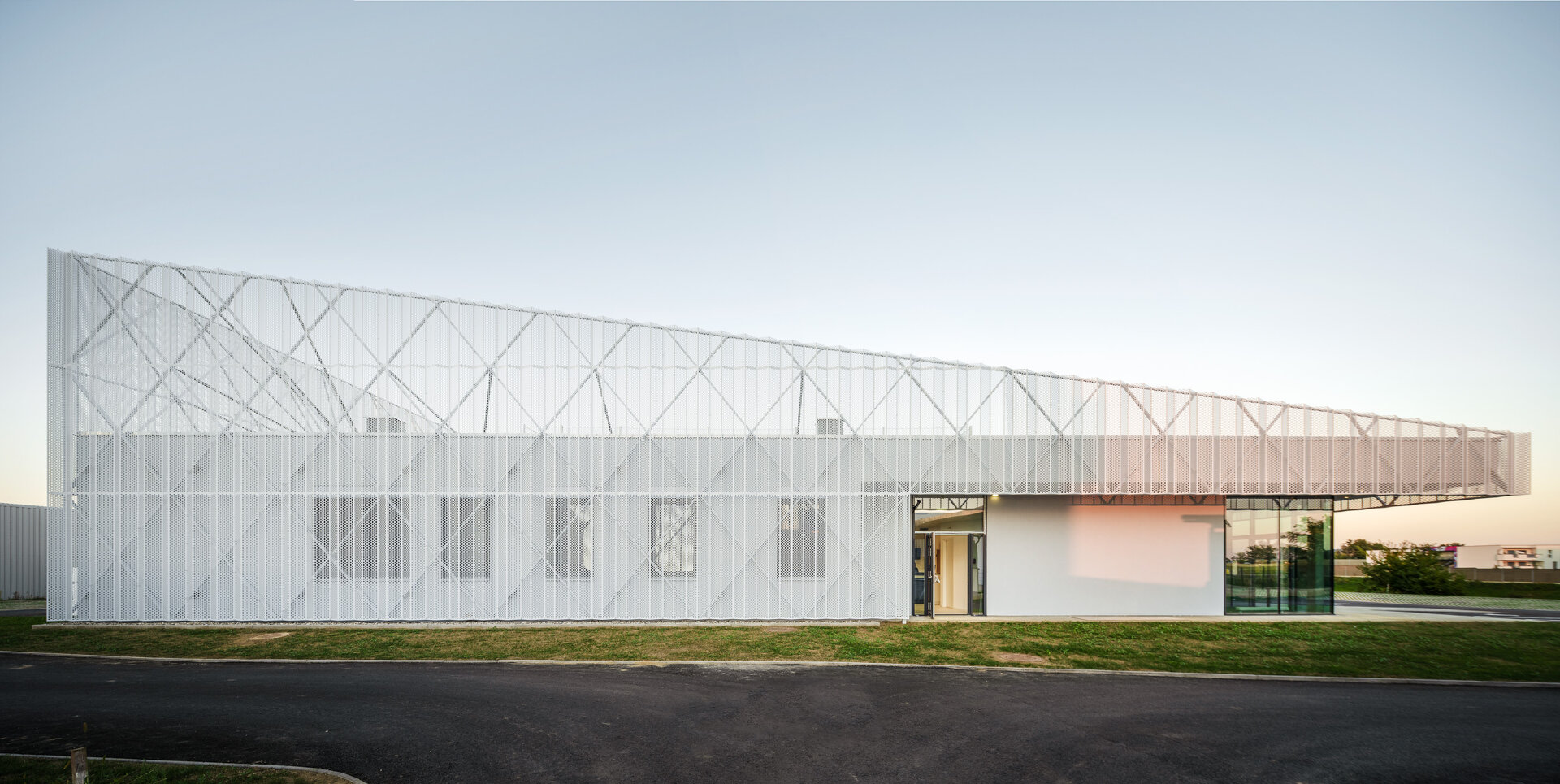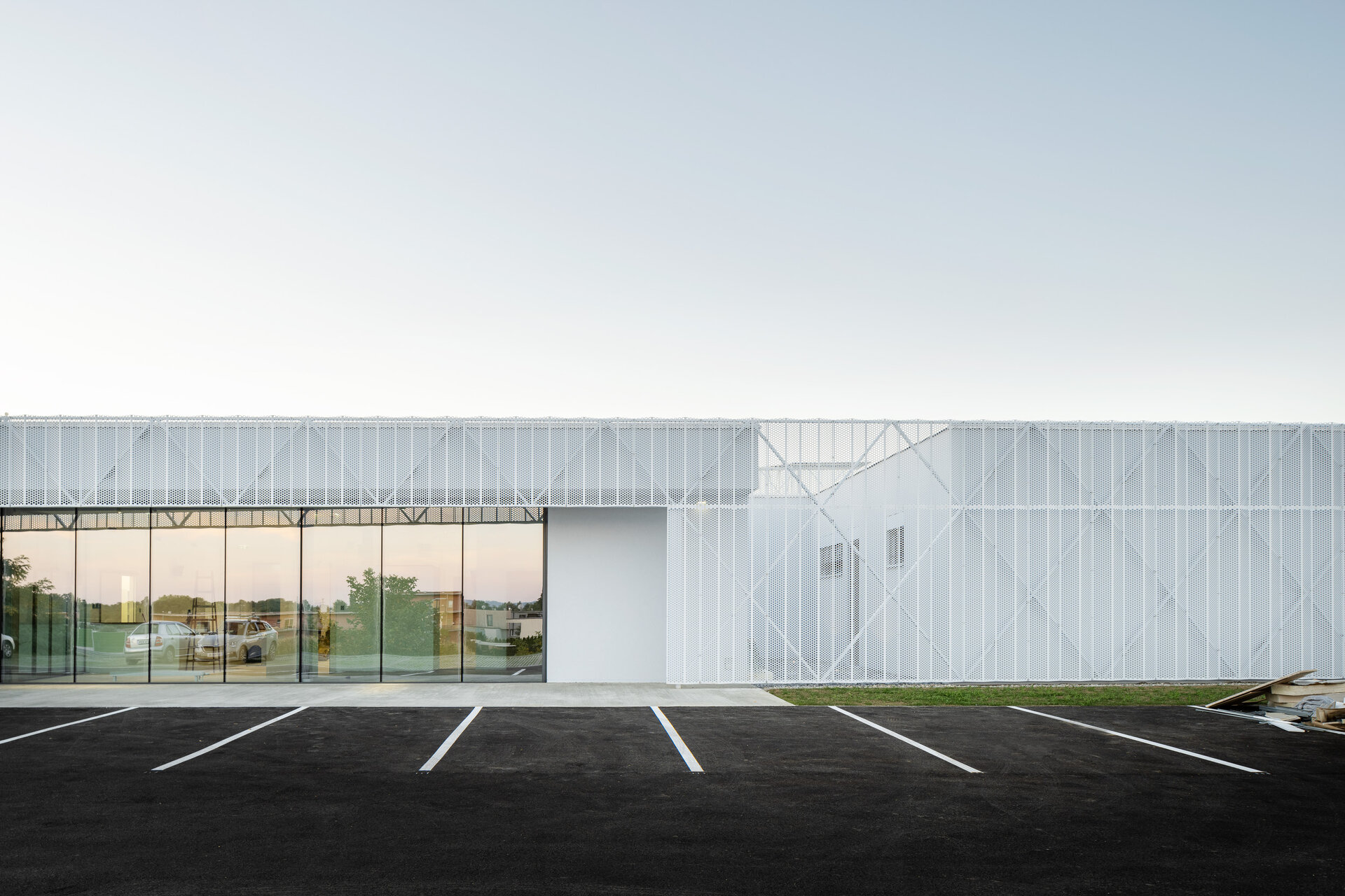 Wie eine Voliere umhüllt die aufsteigende transluzente Fassade aus dreidimensional gefaltetem, großformatigem Lochblech, welches zusammen mit der rautenförmigen Unterkonstruktion ein komplexes Spiel aus Licht und Schatten erzeugt, das gesamte im Süden ein- und im Norden zweigeschossige Gebäude. Dieser schimmernde Metallkäfig verhindert einerseits ein „Ausbüxen“ der vierbeinigen Patienten aus Fenstern und Atrien und dient zugleich als Blickfilter für die am Dach befindlichen Klimageräte und Photovoltaikanlage. Darüber hinaus verleiht er dem Baukörper seine signifikante Figur. (Text: Architekt)