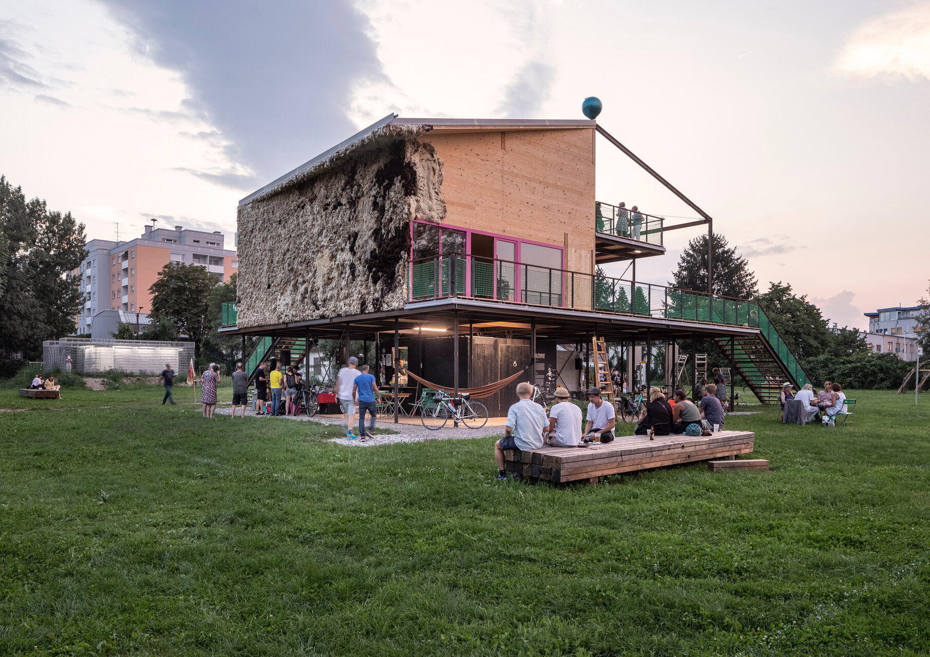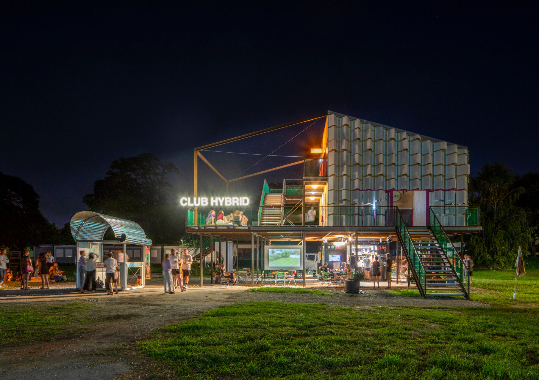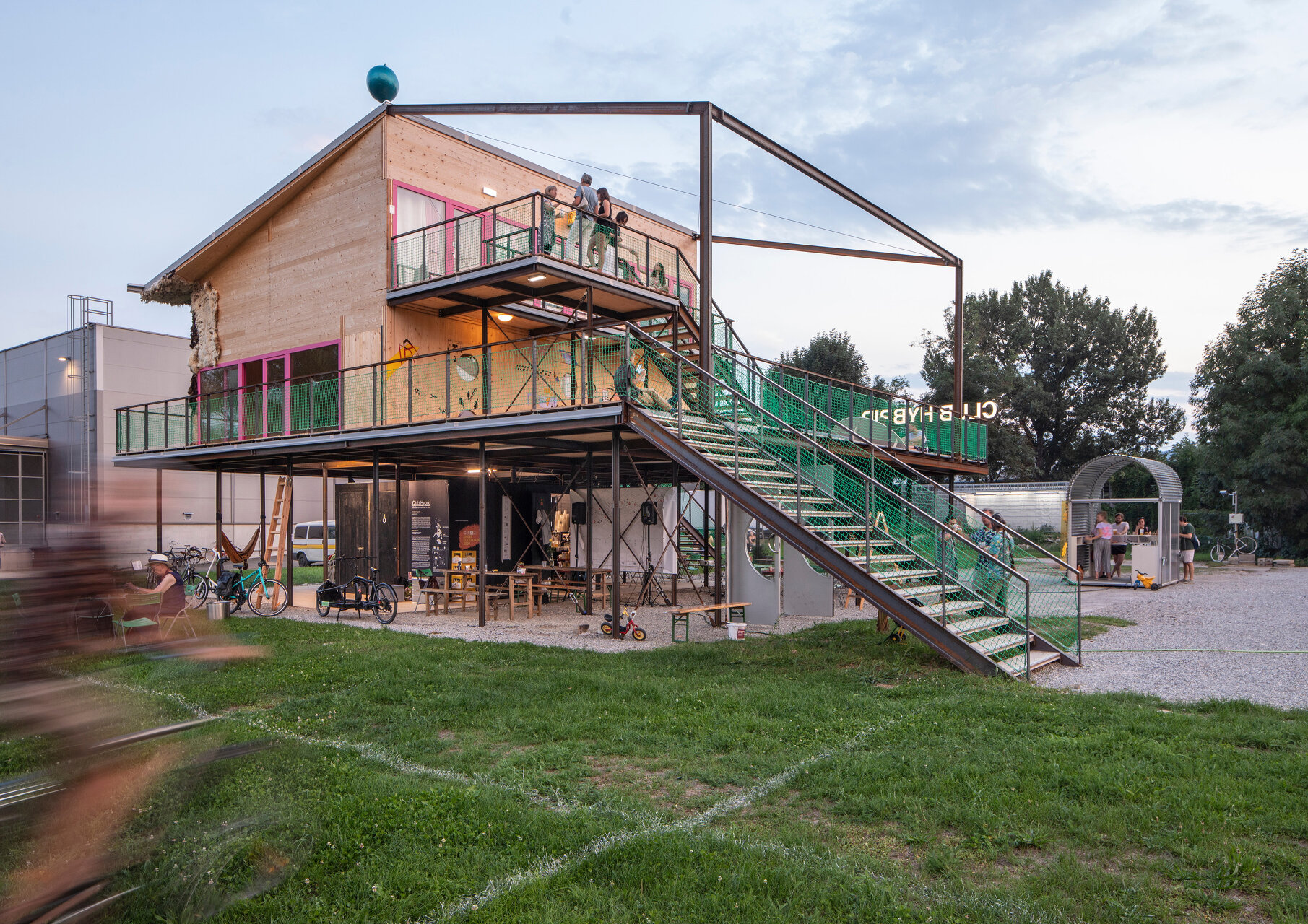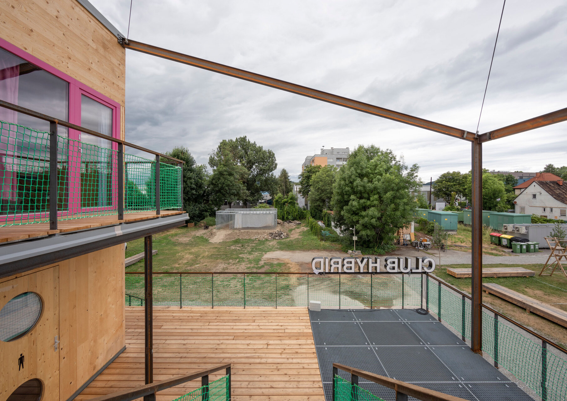 Im südlichen Graz, dort, wo sich Gewerbe, Industrie und Einfamilienhäuser gerne treffen, entstand im Rahmen des Graz Kulturjahres 2020 der Demonstrativbau Club Hybrid. Es ist ein Ort des Experimentierens, des Aus- und Darstellens sowie des Diskurses. Mit wechselnden Gästen und täglichem Programm wurde er im Sommer 2021 zur Werkstatt und zur Bühne in der „urbanen Nebelzone“ der Stadt.Das Grundstück in der Herrgottwiesgasse liegt im Bezirk Gries, der Baustoffhandel auf der gegenüberliegenden Straßenseite befindet sich bereits im Bezirk Puntigam. Der Nachbar im Westen ist das Islamische Kulturzentrum Graz. Wohnen, Arbeiten, Lernen, Sporteln, Beten und Basteln schließen einander hier nicht aus. Dieses dezentrale, heterogene Mischgebiet ist der passende Ort, um an urbanen Notwendigkeiten und Möglichkeiten zu arbeiten.