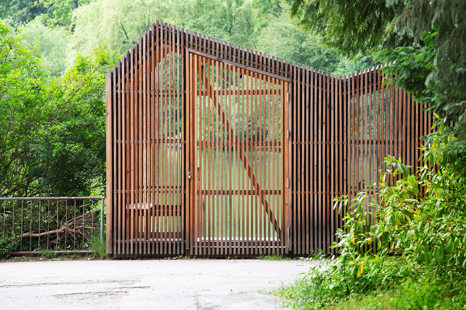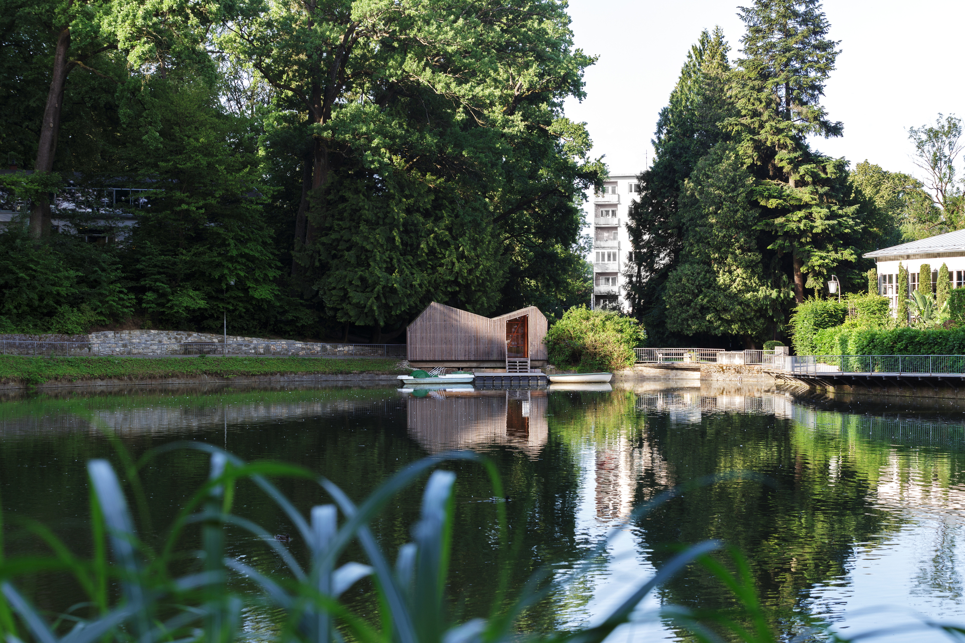 Ausdehnung und Position sind allein schon durch den Spazierweg und das schmale Ufer bestimmt. Zudem hat sich der Ort für die Bewirtschaftung und den Verleih als funktional erwiesen. Schmal und langgestreckt zieht sich der Baukörper von West nach Ost. Nähern sich Spaziergänger:innen von der Straße, ist das Häuschen so positioniert, dass es durch Lamellen gefiltert die Sicht auf den Hilmteich freigibt und sich den Besucher:innen nicht in den Weg stellt. Ist der Verleih in Betrieb, entstehen eine Torsituation und eine Durchlässigkeit zum sportlichen Treiben am Teich.