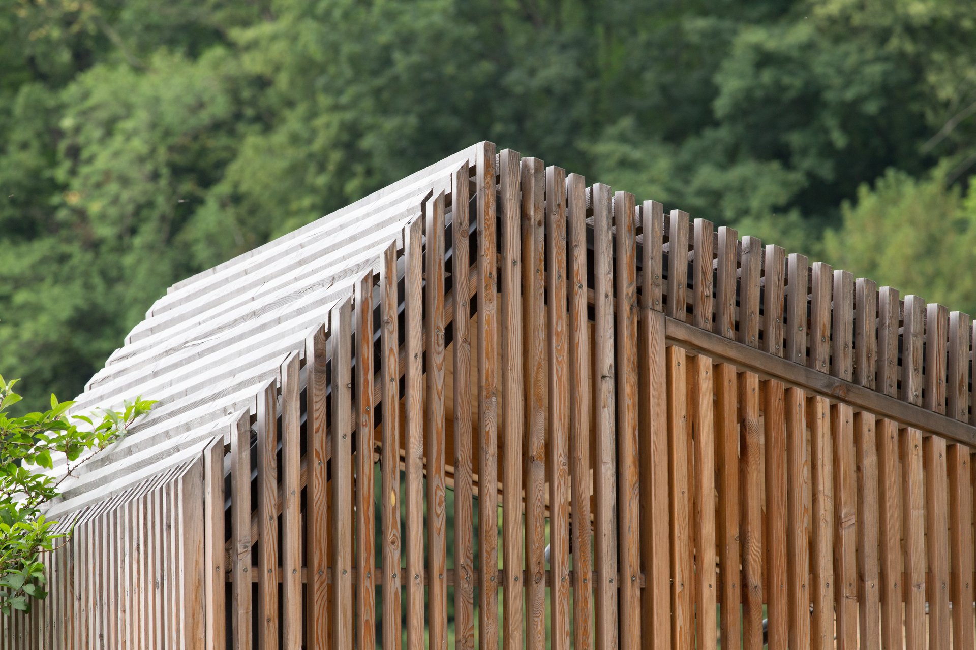 Funktional ist das Gebäude in eine Staufläche und einen überdachten, witterungsgeschützten Bereich geteilt, der Kund:innen als bequeme Garderobe zum Schuhwechsel dient. Verbunden werden die beiden Teile mittels zweier Satteldächer, die zusätzlich zum Teich hin geneigt sind. Die Ausdehnung der rhythmisierenden Satteldächer folgt der Ausdehnung der funktionalen Bereiche.