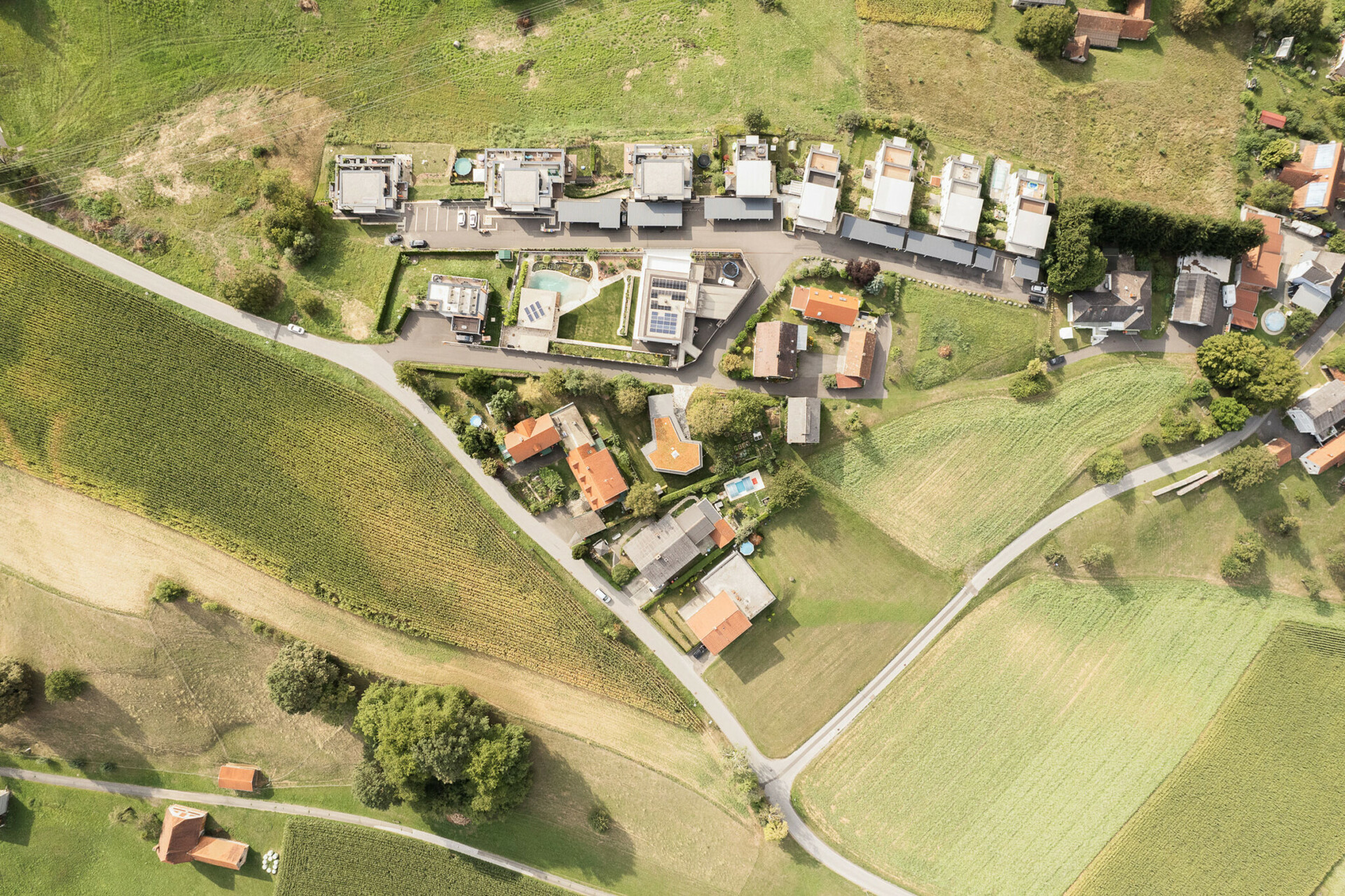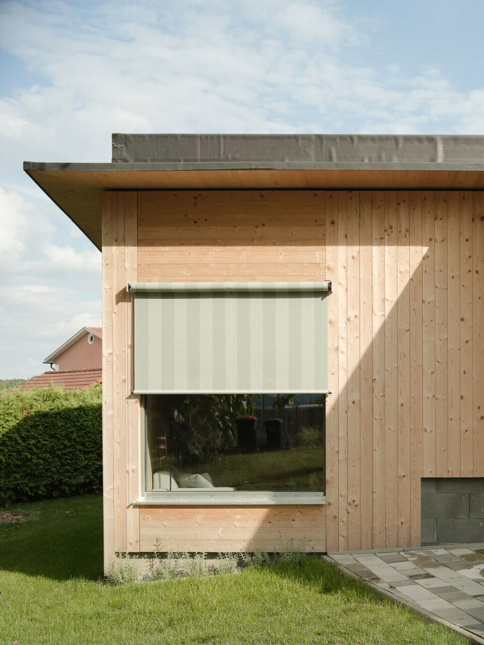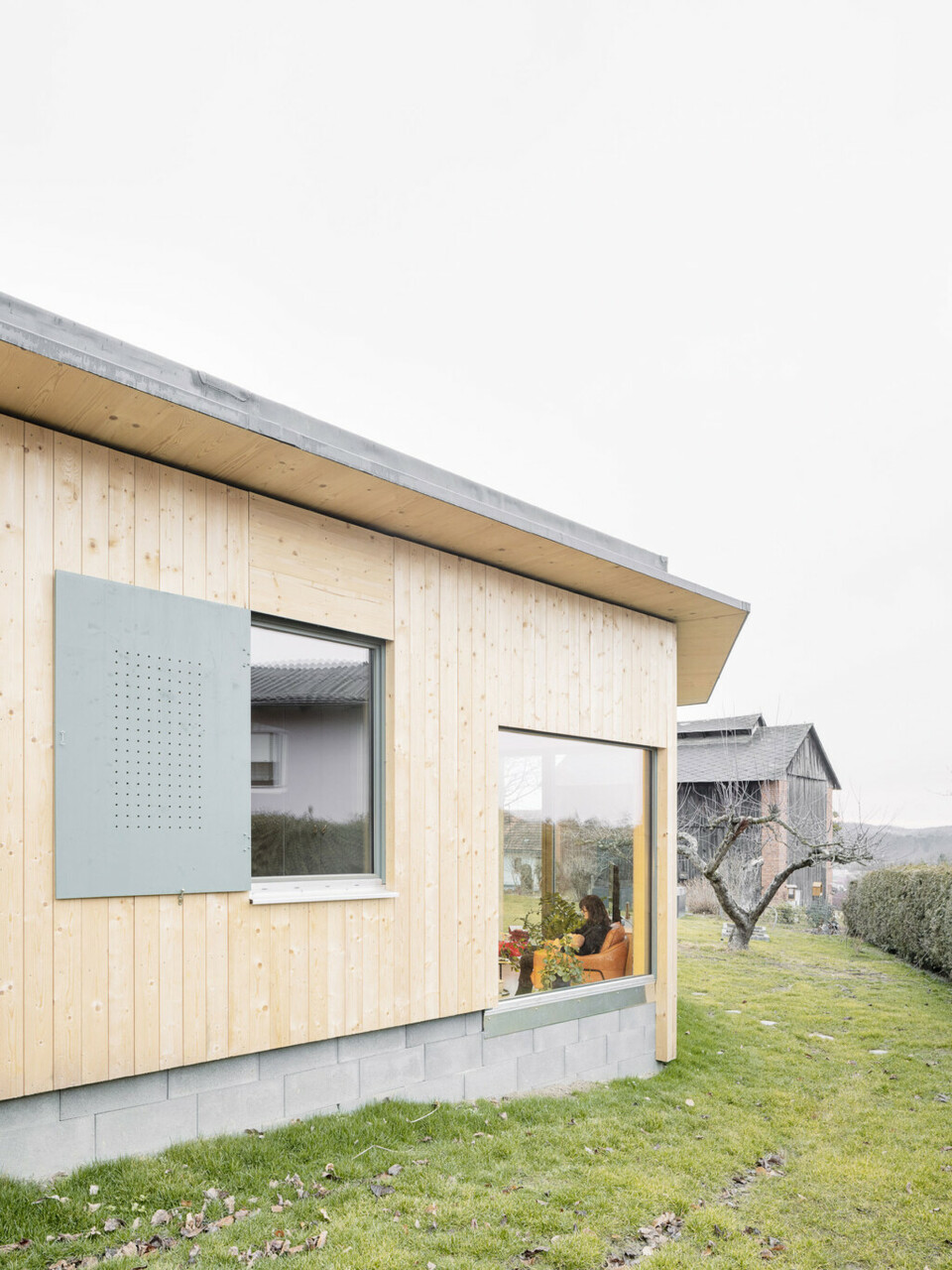 Der massive Sockel schmiegt sich in die lehmige Erde. Geländeveränderung gibt es keine. Jenachdem auf welcher Höhe das Gelände anschließt, sind mehr oder weniger Schalsteine über der Bodenplatte gestapelt. Bewehrt und ausgegossen bilden sie den Sockel für den Holz-Riegel-Bau. Dieser ist mit naturbelassenen Fichtenbrettern verkleidet. Die Schalung verläuft vertikal – so wie sich das flache Haus nach oben strecken will. Dort, wo es konstruktiv Sinn macht oder ästhetisch gut wirkt, verläuft die Schalung horizontal. Ein schmaler, dunkler Hut mit Krempe schließt den Holzbau nach oben hin ab. Die umlaufende Krempe schützt Fassade und Fenster vor Witterung, bildet die Überdachung von Eingang und Terrasse und wird Richtung Einfahrt zum Carport.
