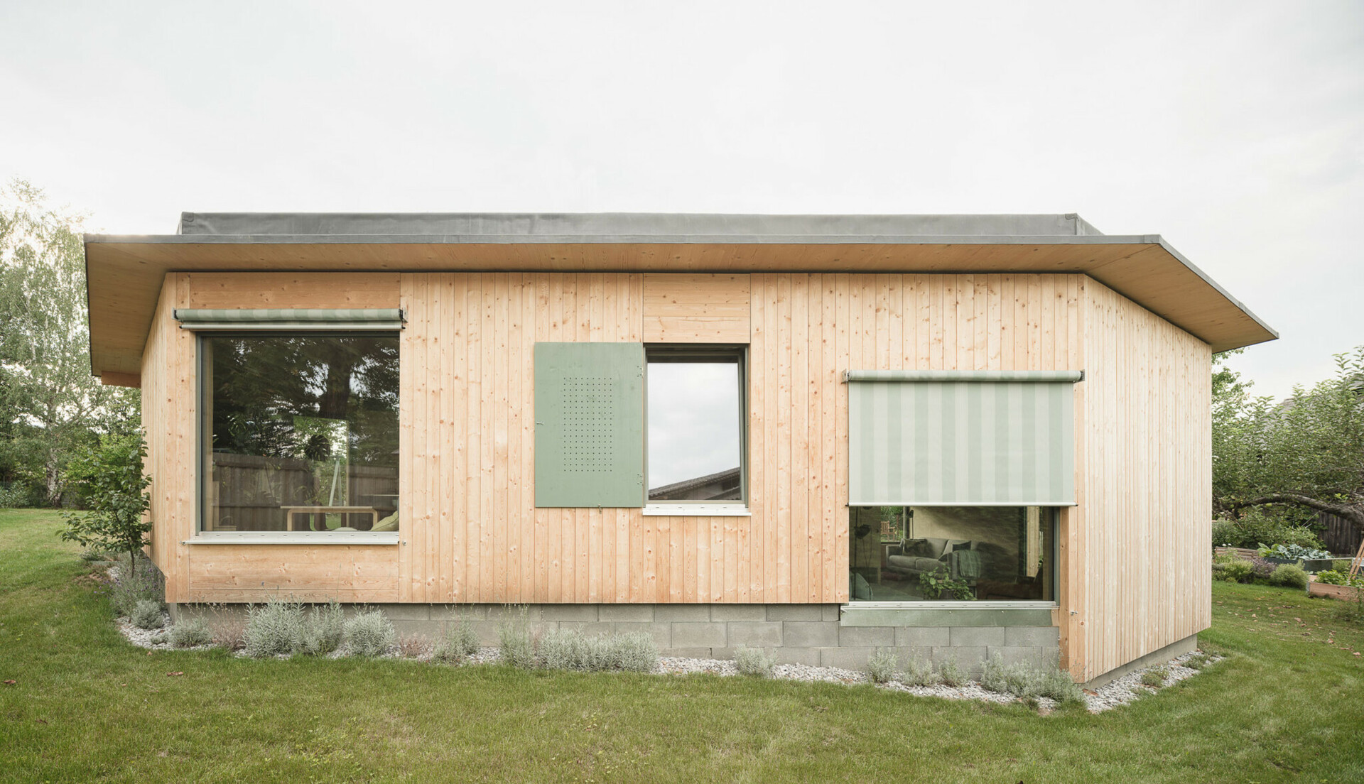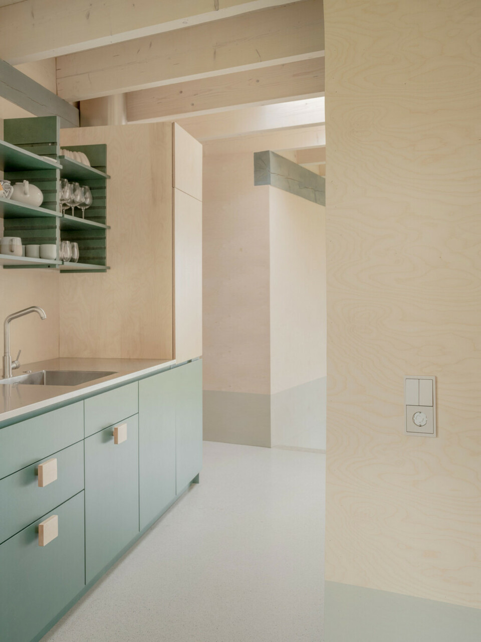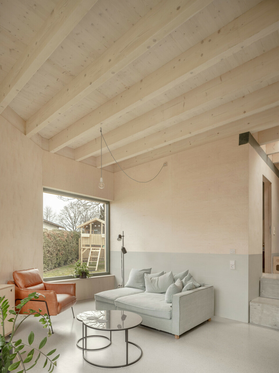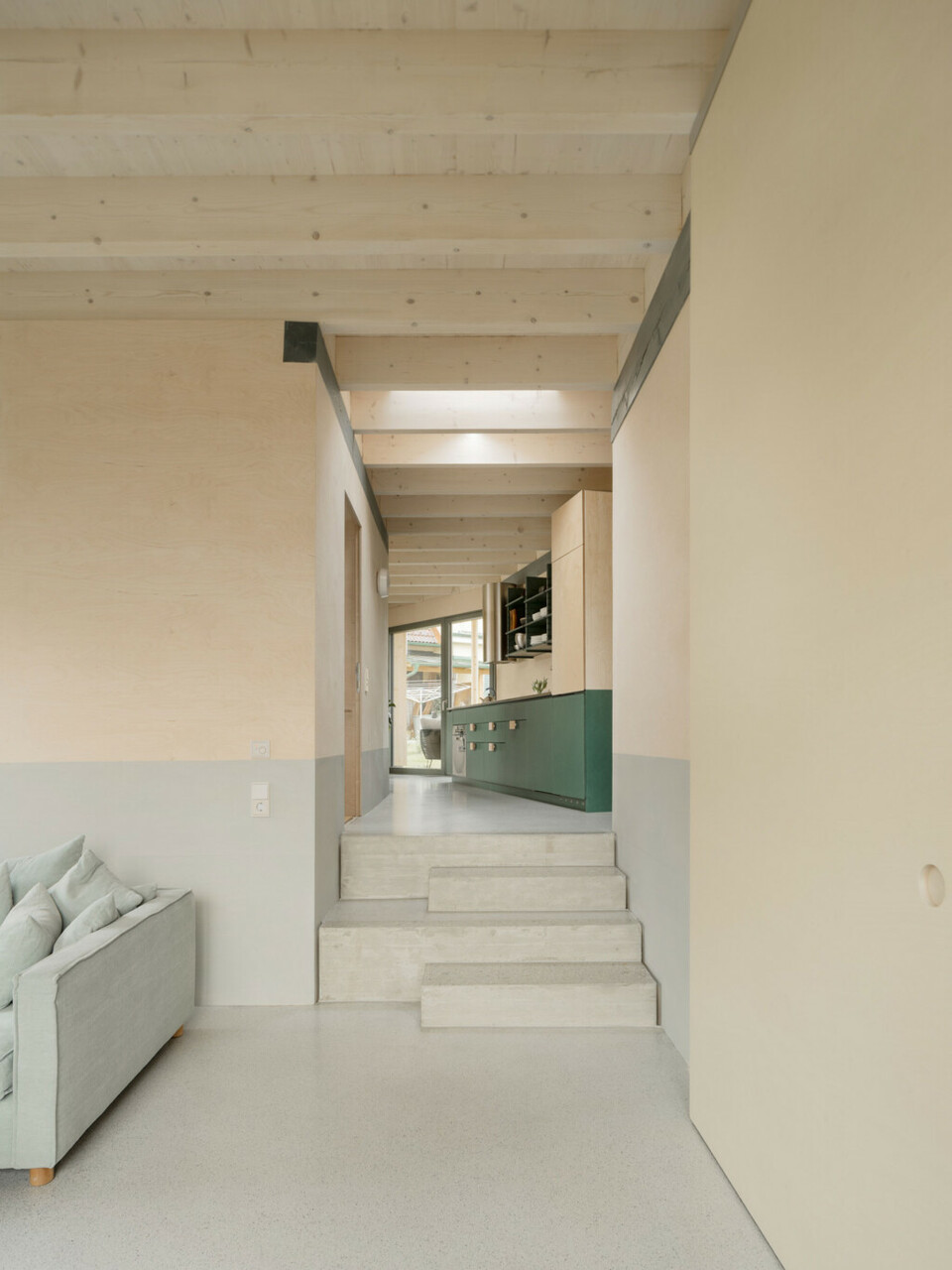 Das begrünte Flachdach geht auf einer Höhe durch. Die Bodenplatte nimmt das leicht abschüssige Bestandsgelände über einen Versprung auf. Vier Stufen führen in das tiefer liegende Wohnzimmer, dessen Raumhöhe sich von 2,5 m auf 3,2 m erweitert. Die weiß lasierten Dachbalken aus Vollholz liegen quer zur Bewegungsrichtung. Unterzüge minimieren Spannweite und Querschnitt der als Durchlaufträger ausgebildeten Dachbalken. Blaugrau gestrichen werden die Unterzüge auch zum Gestaltungselement – neben den grünen Fenstern, der dunkeltürkisen Küche, der hellgelben Schiebetüre und dem graugrünen Sockel. Die restlichen Oberflächen sind naturbelassen aus Birke. (Text: Architekt:innen)