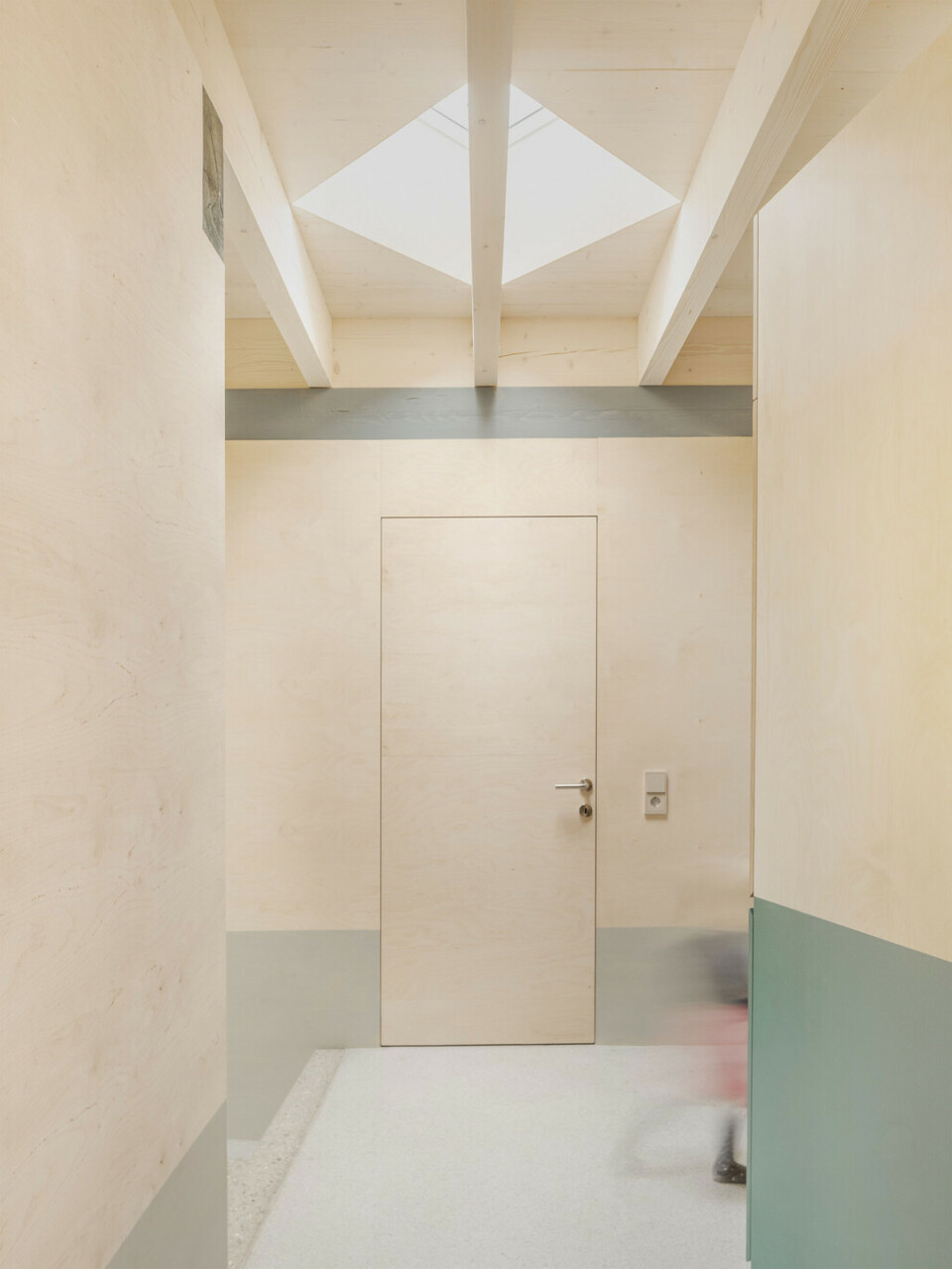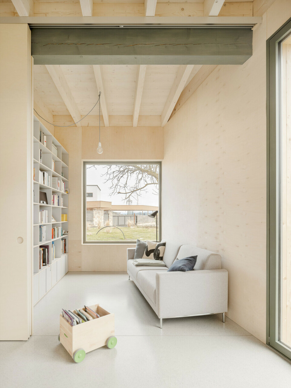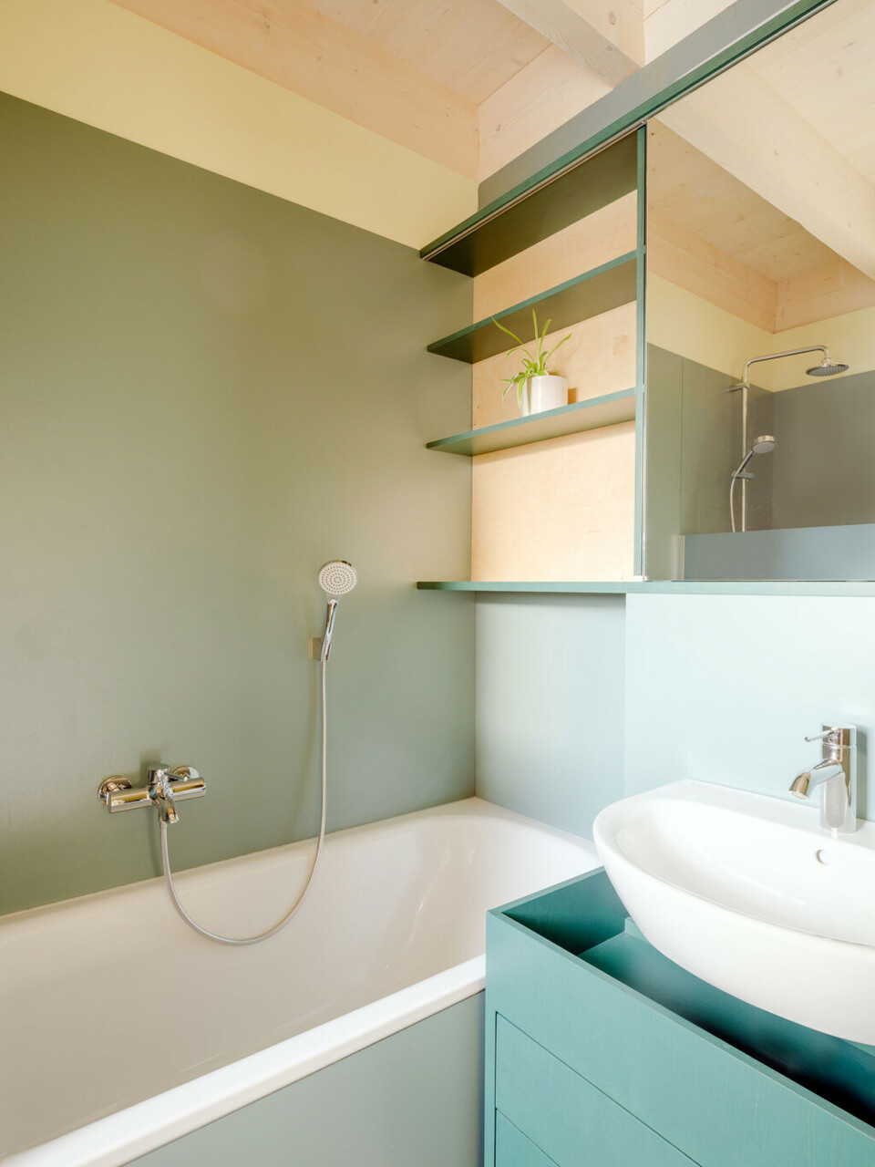 Das begrünte Flachdach geht auf einer Höhe durch. Die Bodenplatte nimmt das leicht abschüssige Bestandsgelände über einen Versprung auf. Vier Stufen führen in das tiefer liegende Wohnzimmer, dessen Raumhöhe sich von 2,5 m auf 3,2 m erweitert. Die weiß lasierten Dachbalken aus Vollholz liegen quer zur Bewegungsrichtung. Unterzüge minimieren Spannweite und Querschnitt der als Durchlaufträger ausgebildeten Dachbalken. Blaugrau gestrichen werden die Unterzüge auch zum Gestaltungselement – neben den grünen Fenstern, der dunkeltürkisen Küche, der hellgelben Schiebetüre und dem graugrünen Sockel. Die restlichen Oberflächen sind naturbelassen aus Birke. (Text: Architekt:innen)