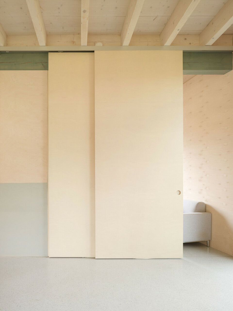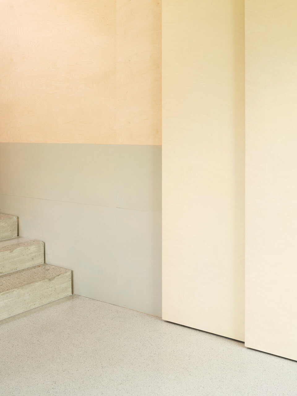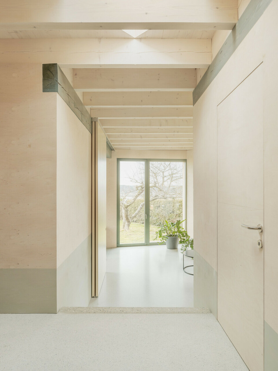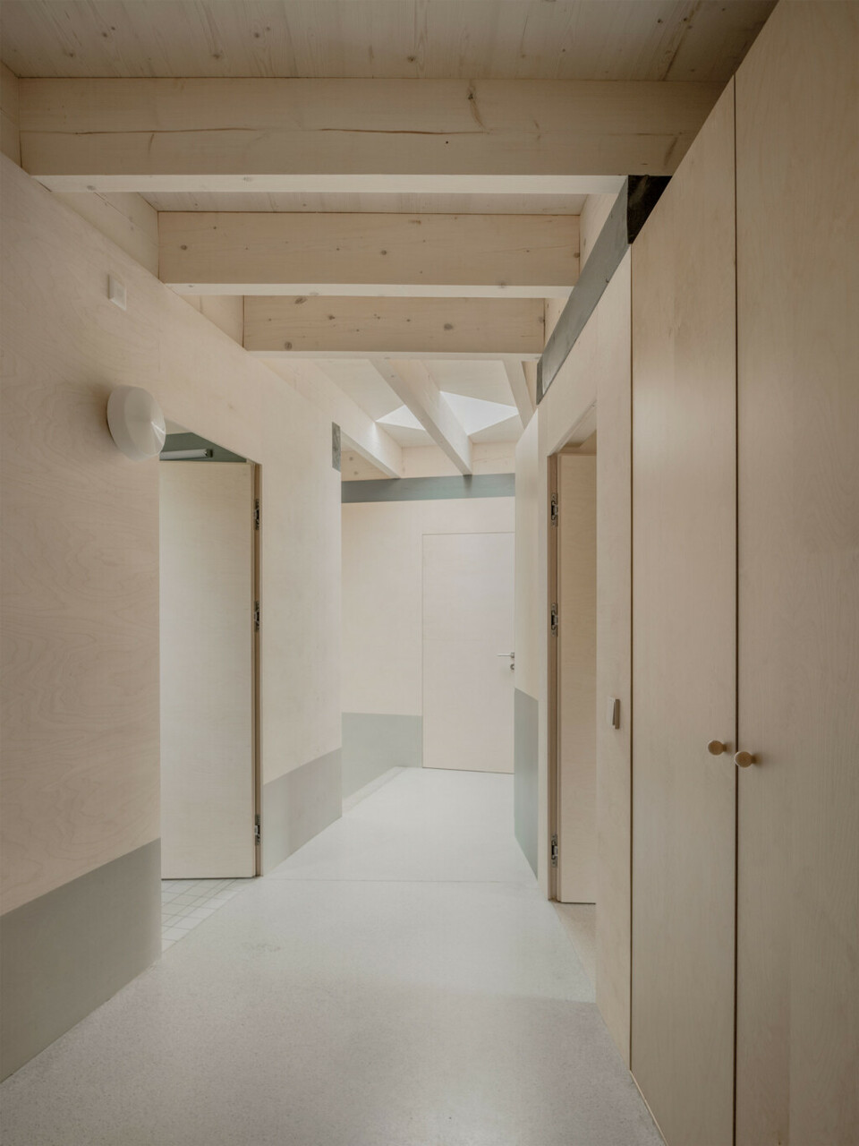 Das begrünte Flachdach geht auf einer Höhe durch. Die Bodenplatte nimmt das leicht abschüssige Bestandsgelände über einen Versprung auf. Vier Stufen führen in das tiefer liegende Wohnzimmer, dessen Raumhöhe sich von 2,5 m auf 3,2 m erweitert. Die weiß lasierten Dachbalken aus Vollholz liegen quer zur Bewegungsrichtung. Unterzüge minimieren Spannweite und Querschnitt der als Durchlaufträger ausgebildeten Dachbalken. Blaugrau gestrichen werden die Unterzüge auch zum Gestaltungselement – neben den grünen Fenstern, der dunkeltürkisen Küche, der hellgelben Schiebetüre und dem graugrünen Sockel. Die restlichen Oberflächen sind naturbelassen aus Birke. (Text: Architekt:innen)