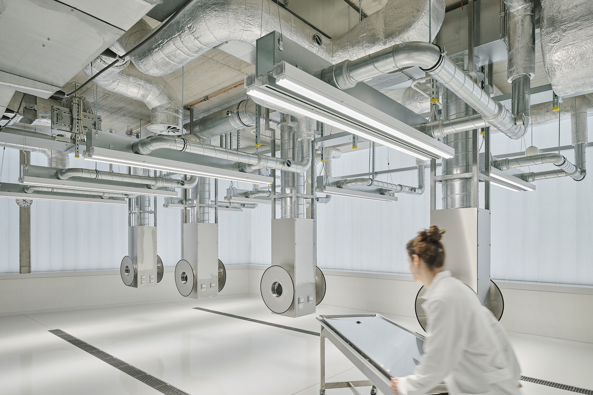 In den Seziersälen sind für einen sicheren Umgang mit den Leichnamen spezielle Lüftungsanlagen notwendig, um die Formaldehydbelastung bei den Seziertischen zu reduzieren. Weil für das Belüftungssystem in dieser Dimension kein tauglicher Stand der Technik vorhanden war, entwickelten die Architekt:innen die Anlage für diesen besonderen Anwendungsfall im Rahmen des Projekts eigens als Prototyp. In Zusammenarbeit mit den Fachexpert:innen der Med Uni starteten sie Versuche an 1:1-Mock Ups, führten Rauchversuche durch, um die Luftverteilung zu analysieren und ließen mittels Computersimulation eine Luftströmungsstudie erstellen.