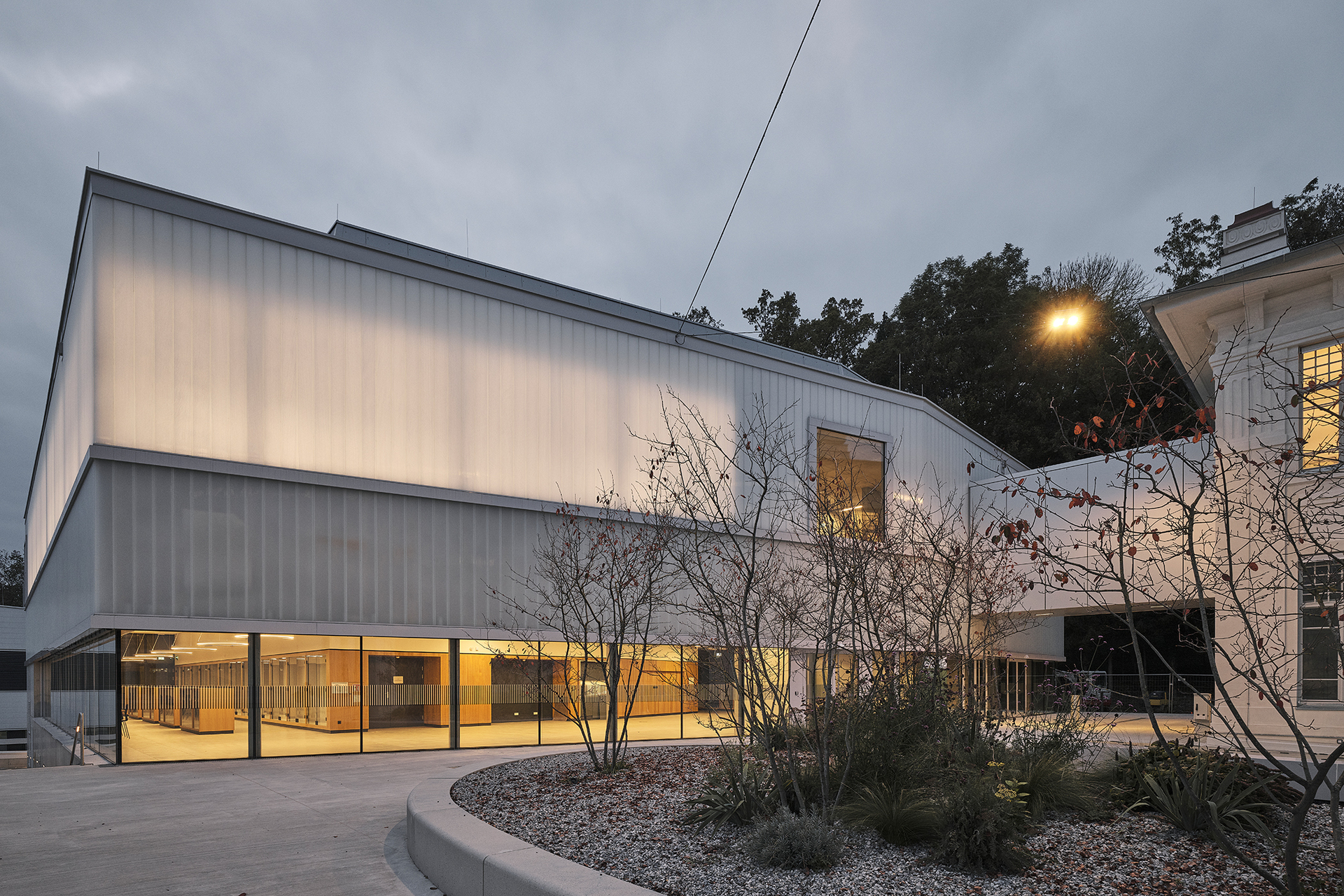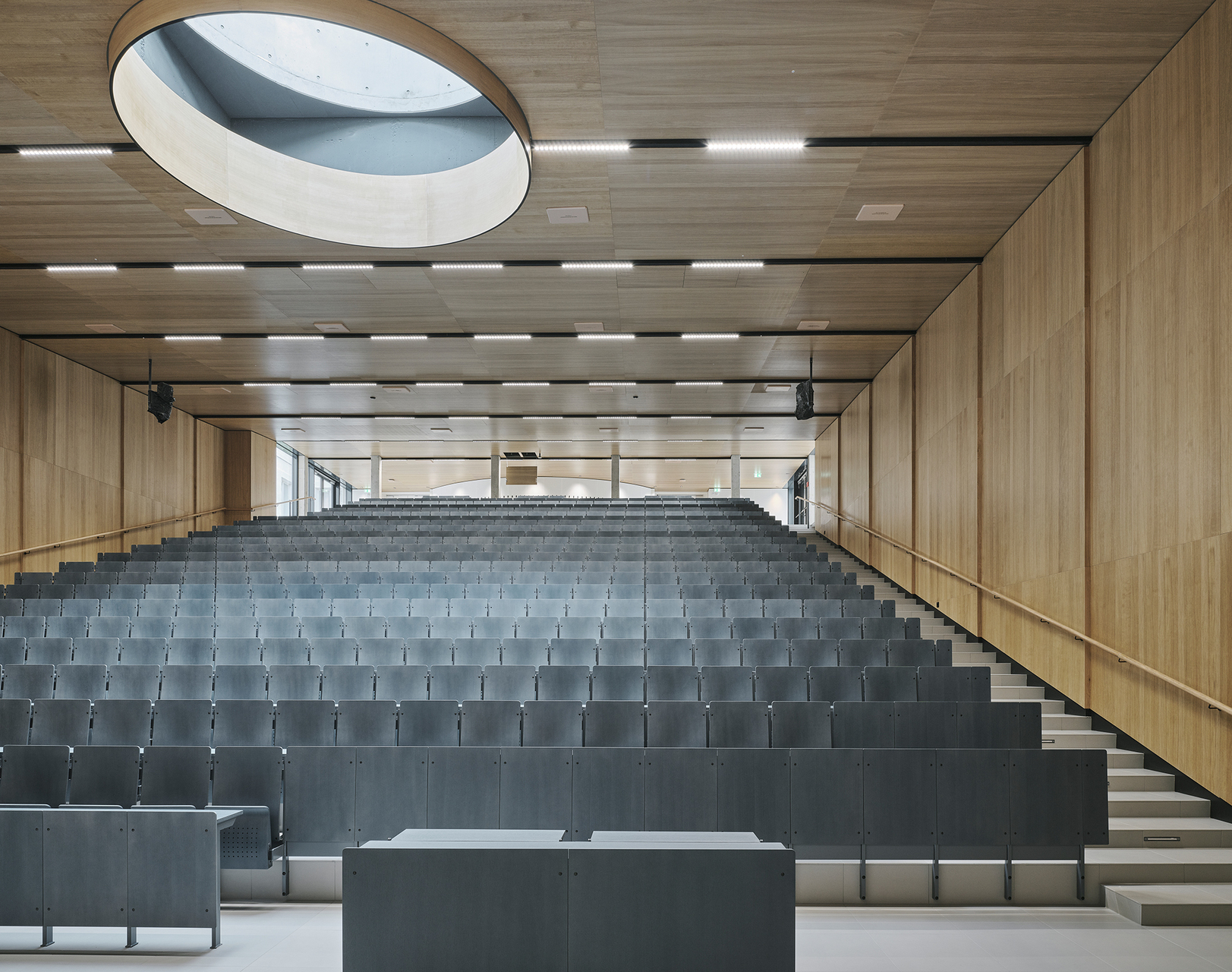 In den Sezierbereichen wurde deshalb ganz bewusst auf schlichte und pragmatische architektonische Detaillösungen gesetzt, um ruhige Räume zu schaffen, die nicht gänzlich von der Technik vereinnahmt werden. Eine Profilglasfassade mit transluzenter Wärmedämmung sorgt für eine natürliche Belichtung und schützt gleichzeitig vor unerwünschten Einblicken von außen. So gelingt hier die Balance zwischen räumlicher Offenheit und pietätsvoller Abgrenzung. Als Verbindung zwischen Neubau und Altbestand wurde auf dem Platz dazwischen ein holzvertäfelter Hörsaal für 500 Studierende realisiert. Über die verglaste Rückseite sowie ein kreisrundes Oberlicht wird der große Raum mit viel Tageslicht versorgt. Darüber entstand ein urbaner, begrünter Platz, der Alt- und Neubau fußläufig verbindet.