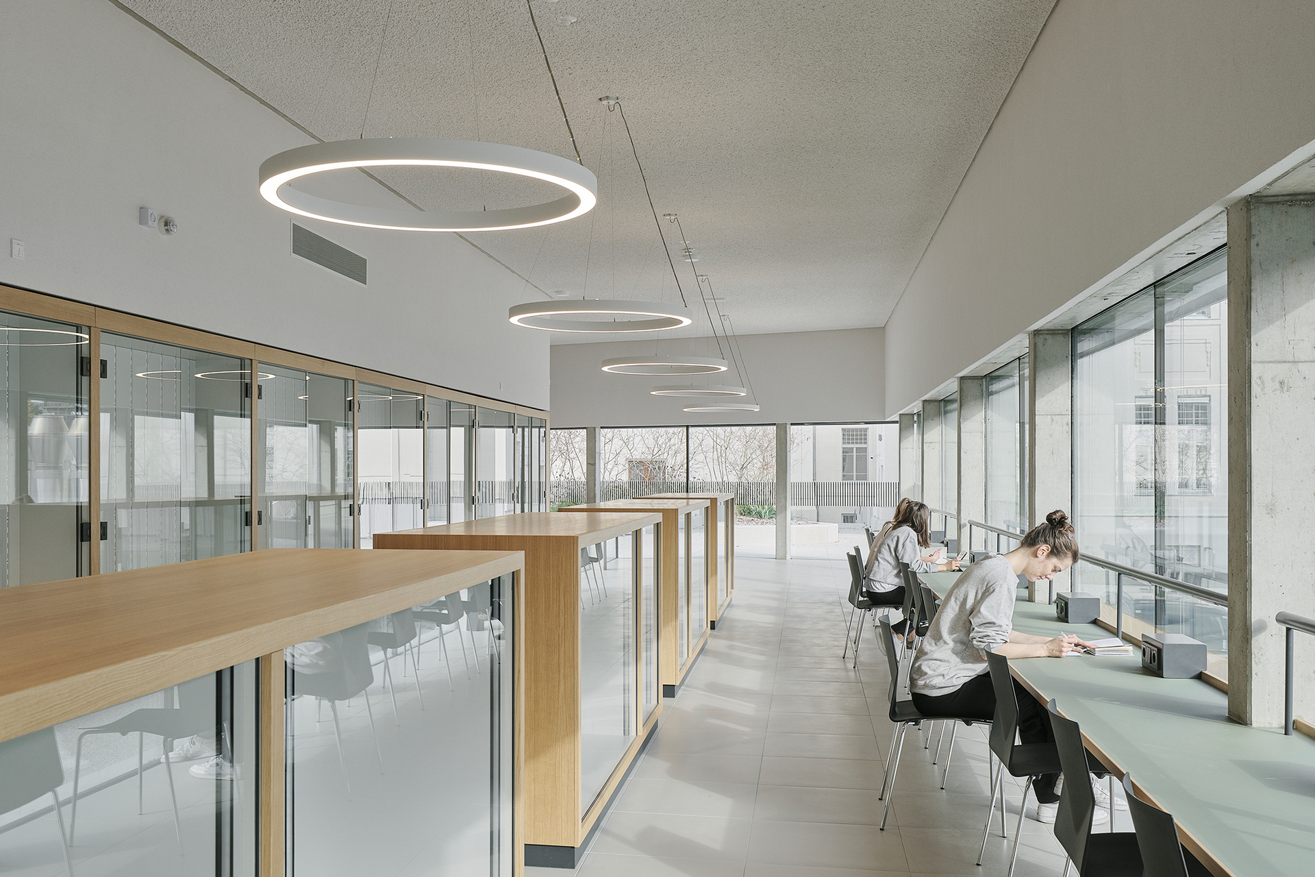 Der denkmalgeschützte Altbestand mit der Verwaltung, Seminar- und Laborräumen, der Bibliothek sowie einem historischen Anatomiesaal mit gusseisernen Sitzbänken wurde sanft saniert, aufwändig restauriert und von einem Gründerzeitgebäude zu einem Labor ausgebaut. Der größte Eingriff im historischen Gebäude wurde mit dem historisch immer fehlenden und nun neu geschaffenen Haupteingang an der Ostseite vorgenommen: Dazu wurden nachträglich errichtete Teile abgetragen und Platz für ein helles, einladendes Foyer geschaffen – einen zentralen Eingangsbereich, der Orientierung gibt, und der die Studierenden, Mitarbeiter:innen und Besucher:innen dieser von außen unscheinbaren, im Inneren aber technisch einzigartigen Lehr- und Forschungsstätte angemessen empfängt. (Text: Architekt:innen, bearbeitet)
