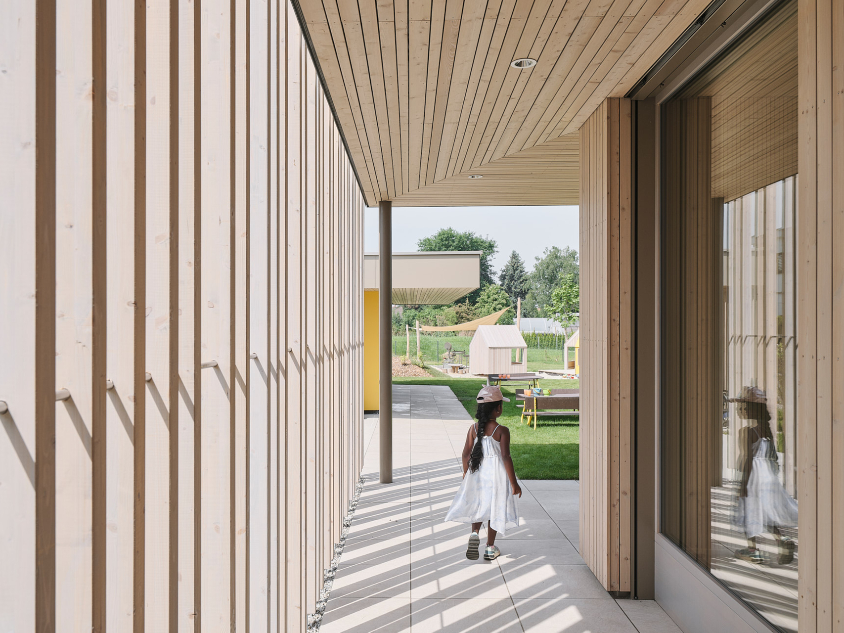 Der neue Kindergarten ist ein gelungenen Bespiel für das optimale Zusammenspiel von Architektur und Pädagogik. Es ist schön zu beobachten, wie die Kinder in ihrem freien Spiel ihren unterschiedlichen Neigungen nachgehen und die Architektur das offene Konzept unterstützt und ergänzt. Fließende Übergänge – einerseits von Innen- und Außenbereichen sowie auch innerhalb der unterschiedlichen Raumzonen – sind die grundlegende Gestaltungsqualität. Die Innenräume verfügen über eine hohe funktionelle und räumliche Vielfalt. Ineinander übergehende Raumsituationen, angebundene Nischen, Möglichkeiten zur Mehrfachnutzung, Galeriesituationen, multifunktionale Möbeleinbauten, Zonierungen, Transparenz, Durchlässigkeit und Licht aus allen Himmelrichtungen bieten dem Konzept des „offenen Kindergartens“ die räumliche Entsprechung. So entsteht ein Eindruck der Verbundenheit zwischen den Kindern und Pädagogen. Der freie Grundriss wird hier tatsächlich umgesetzt, und zwar nicht nur im räumlichen Sinn, sondern auch durch die visuellen Durchlässigkeiten.
