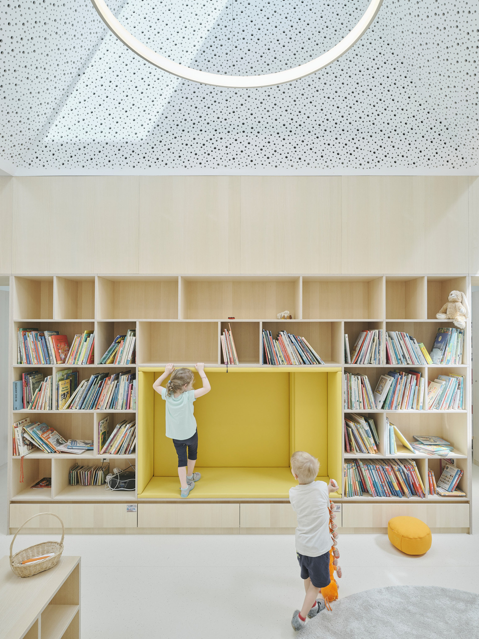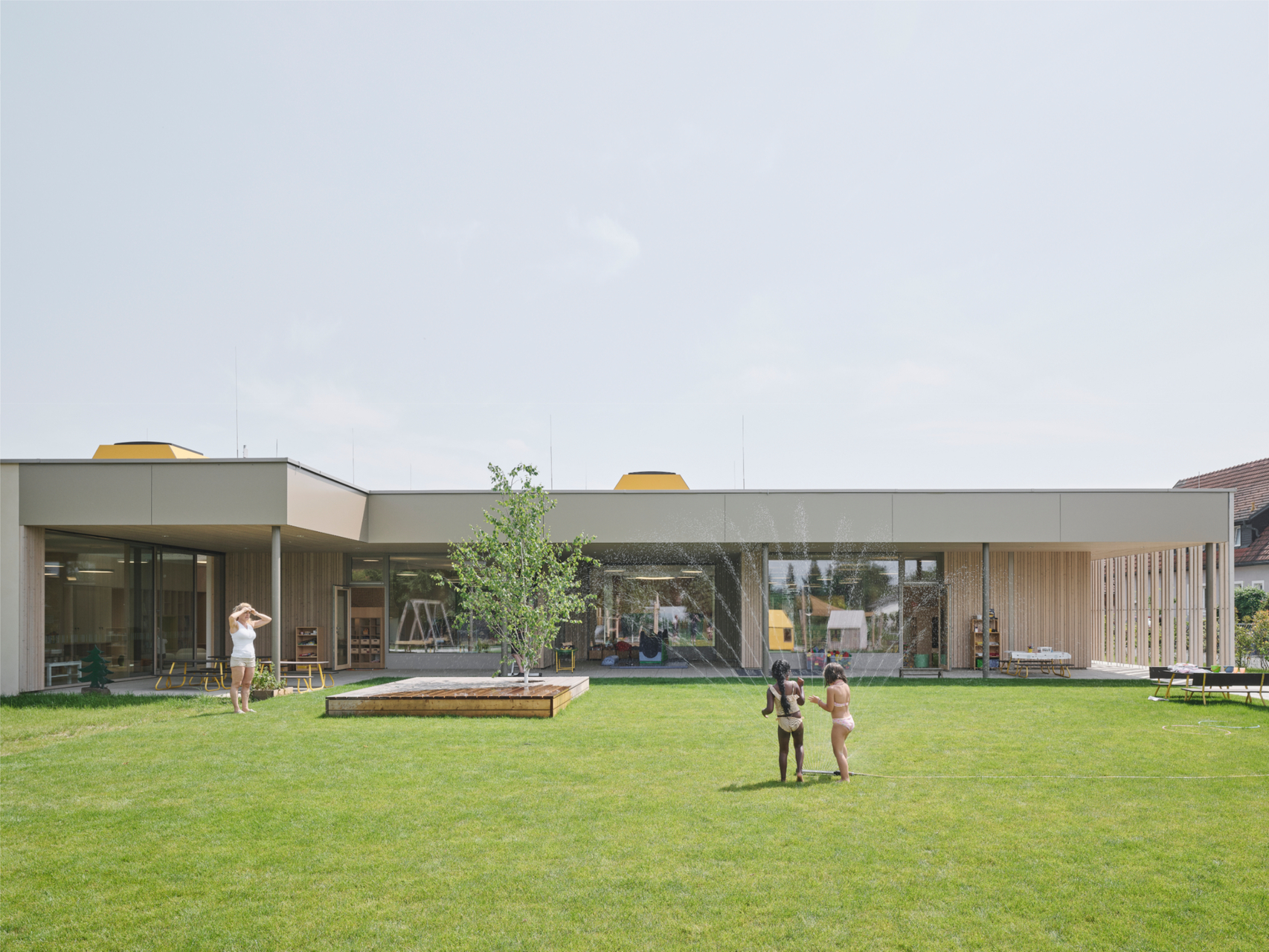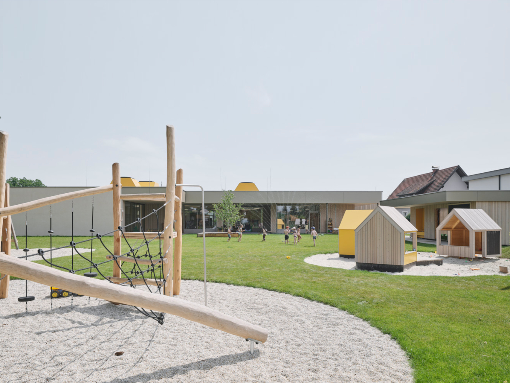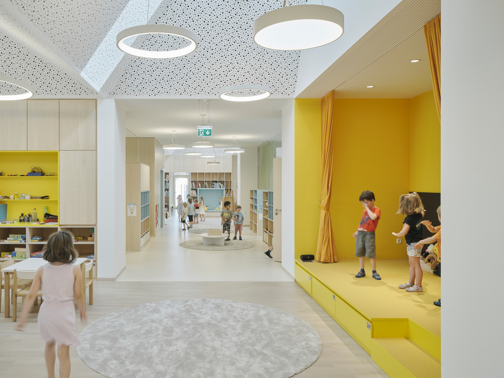 Grund ist eine Atmosphäre, in der die Pädagog:innen gerne arbeiten und die Kinder sich wohl und sicher fühlen. Das schönste Kompliment ist laut der Leiterin die Tatsache, dass es bei Kindergartenneulingen keine Eingewöhnungsphase gibt – „die Kinder fühlen sich vom ersten Tag an angekommen und zu Hause“. (Text: Architekt:innen, bearbeitet)