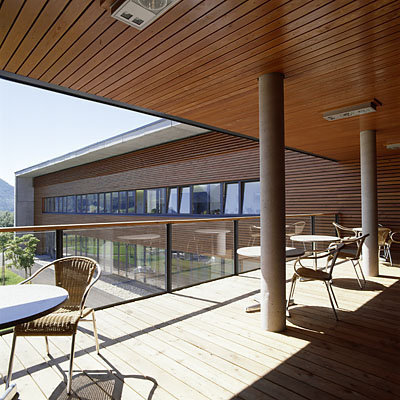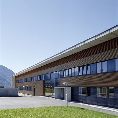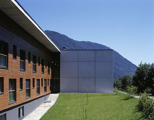 Ein Bügel aus Sichtbeton, der die Schmalseiten und das Flachdach umhüllt, bildet die symbolträchtige Fassung der beiden Trakte und ist zugleich ein Rahmen für die Fassaden der Längsseiten, die zwar unterschiedlich ausgebildet sind, aber durch das Motiv der feinen horizontalen Lattung aus imprägnierter Lärche einen einheitlichen Charakter erhalten. (Text: Karin Tschavgova)