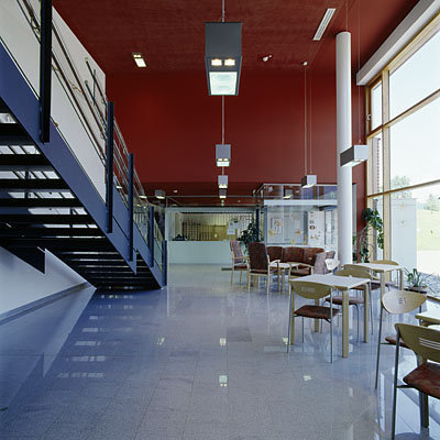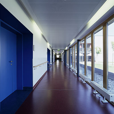 Die allgemeinen Bereiche der Anlage - Speisesaal, Therapie- und Aufenthaltsräume, Verwaltung und die Empfangsloge – sind, der Vorfahrt und den Ankommenden zugewandt, im zweihüftigen Bauteil untergebracht. Eine offene, von Süden besonnte Aufenthaltszone mit gedeckter Terrasse bildet den Übergang zu einem schmalen, einseitig nach Westen ausgerichteten Appendix, der in beiden Geschossen ausschließlich Einzelzimmer enthält. Hier wie dort soll ein klares Farbkonzept die Orientierung erleichtern.