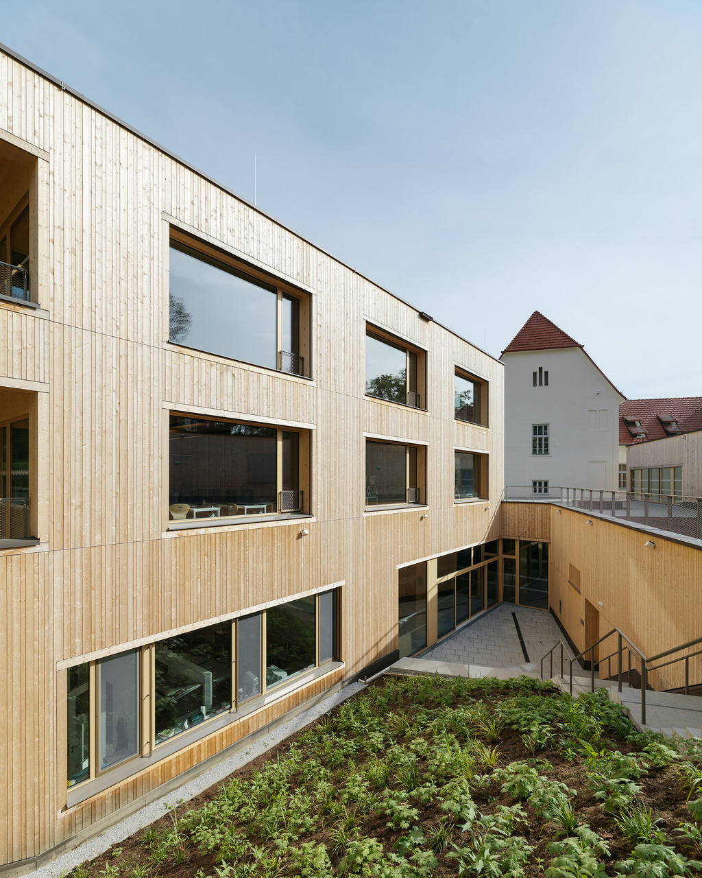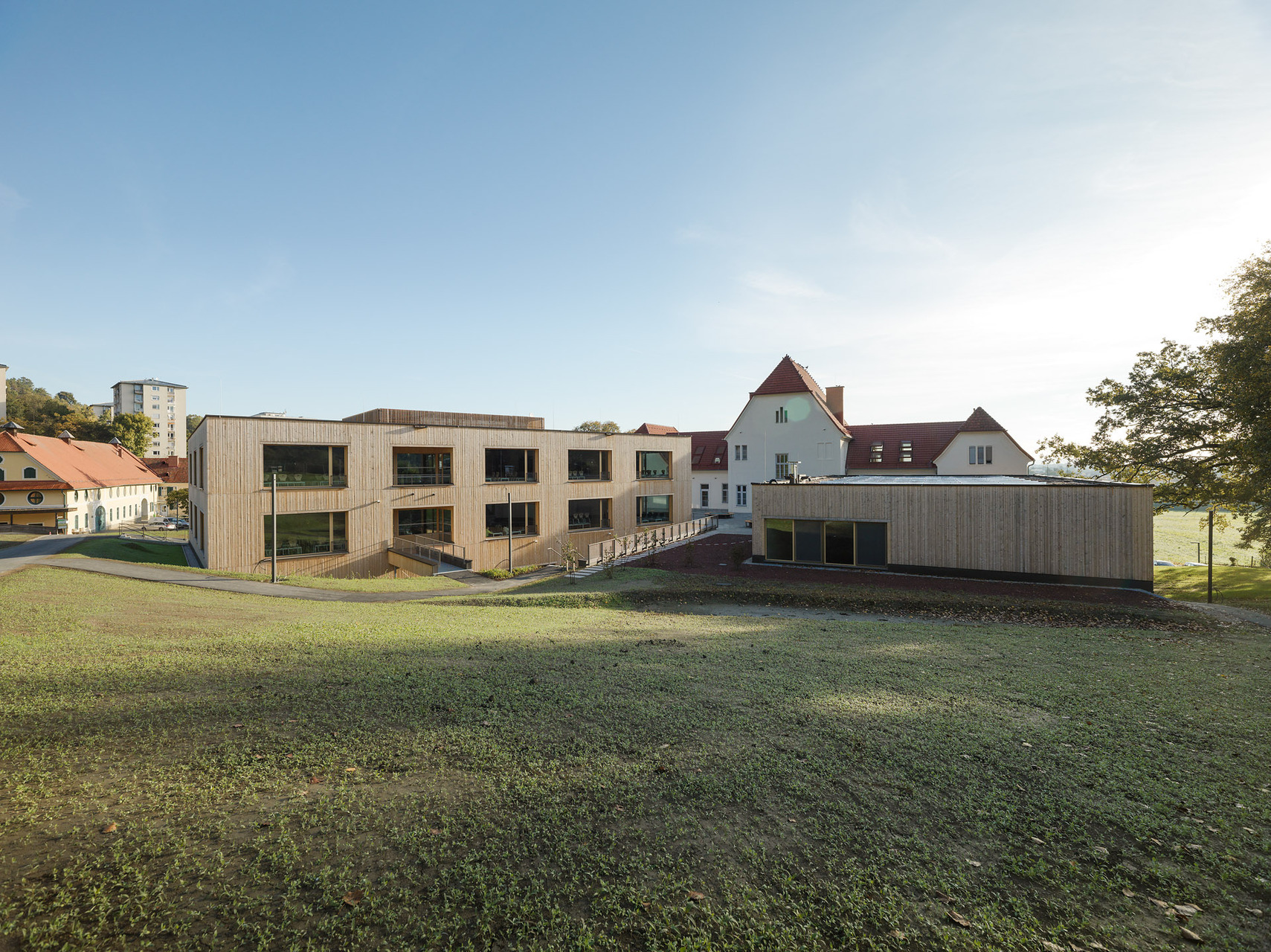 Der Zubau schmiegt sich an den Rücken des Schulgebäudes; behutsame Aufteilung des Bauvolumens, schlichte Formensprache und konsequenter Materialeinsatz stellen klar, dass hier keine Konkurrenz angestrebt ist, sondern eine sich dennoch nicht anbiedernde Erweiterung.