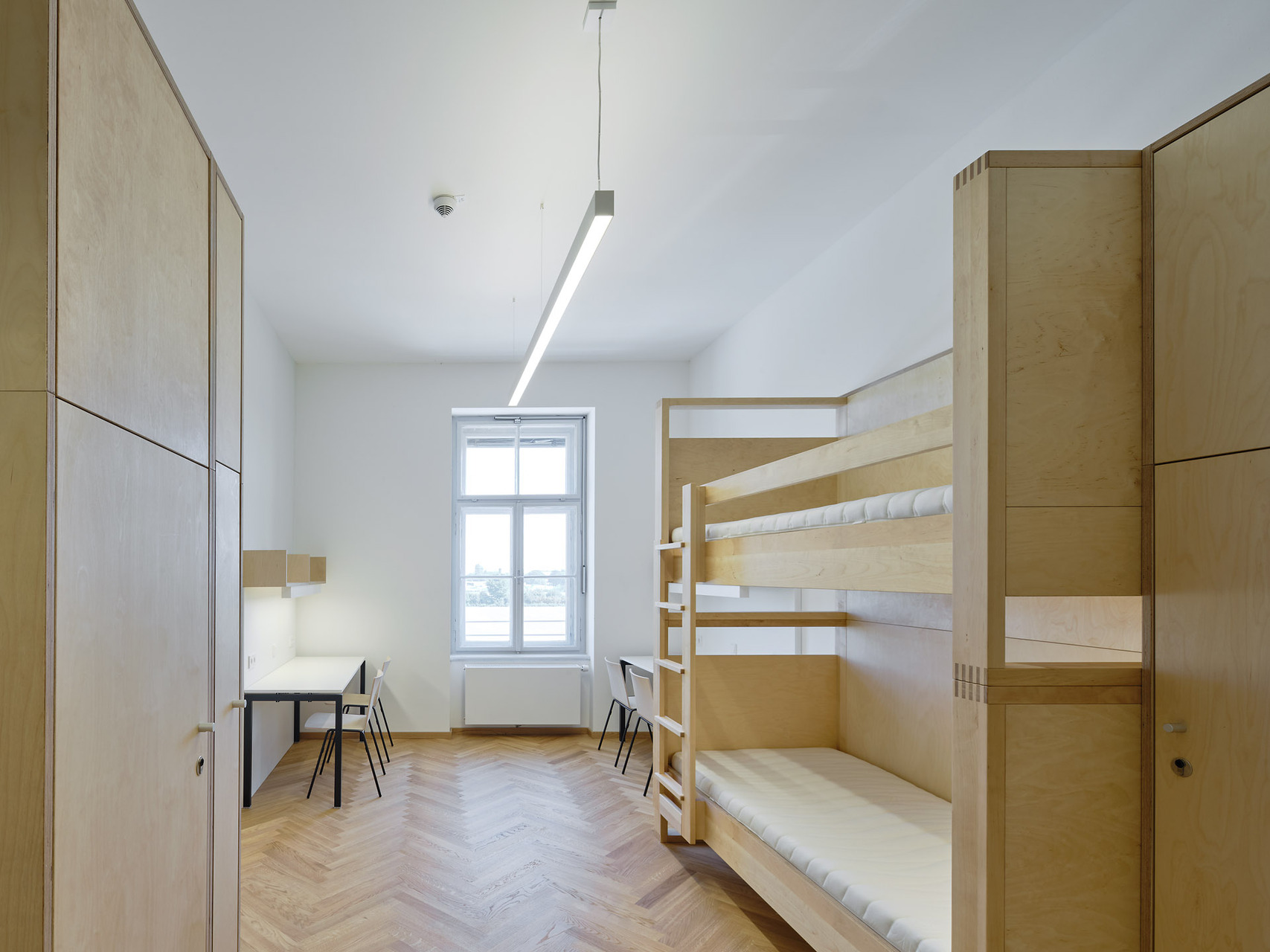 Zusätzliche Atmosphäre erhält dieses Raumkontinuum durch die zur Innenwand mutierte denkmalgeschützte Fassade der renovierten Schule. In deren ehemaligen Klassenzimmern finden sich teils barrierefreie 2-, 3-, und 4-Bettzimmer samt eigenen Sanitäreinheiten für 78 Schüler:innen. Die wohltuend hohen Räume wurden wie jedes Landesinternat von cebra-Architekten mit einheitlichen, robusten, zeitlos schlichten Holzmöbeln ausgestattet, „luxuriös“ ist allerdings der Blick in den Wald oder auch auf die Stadt.