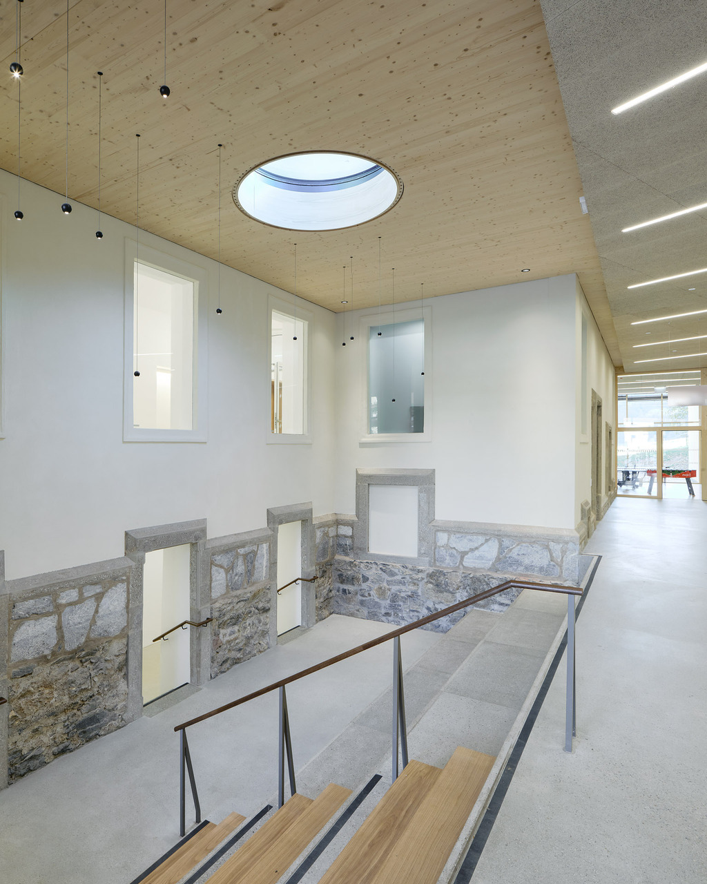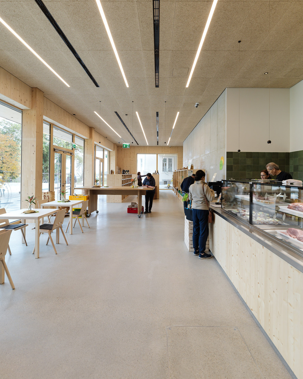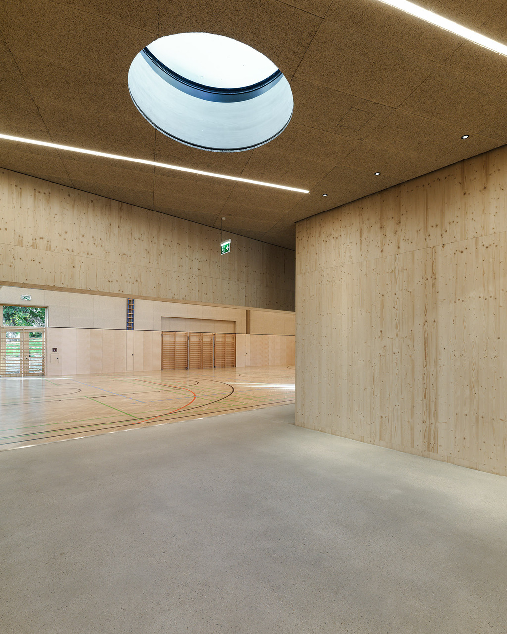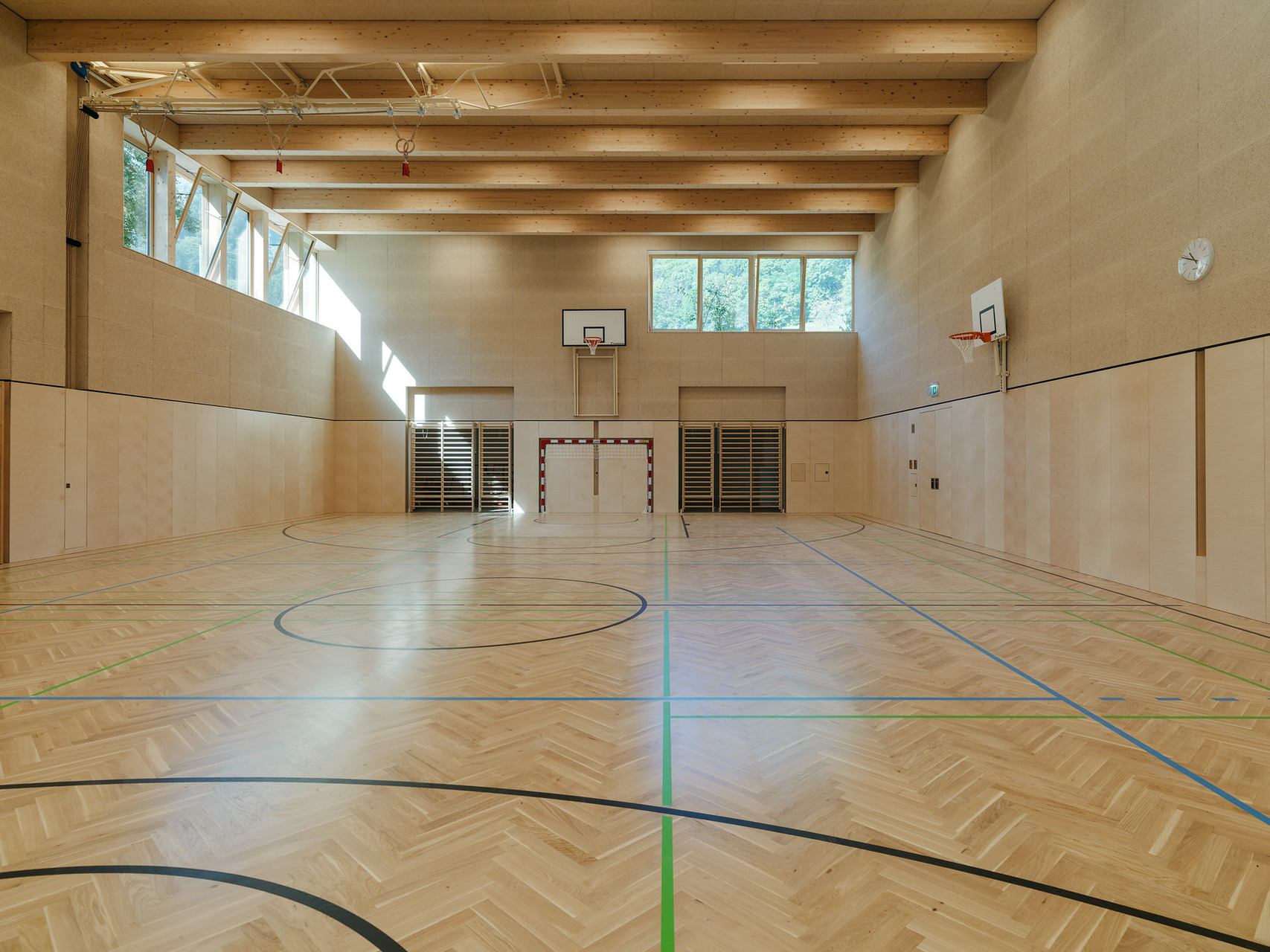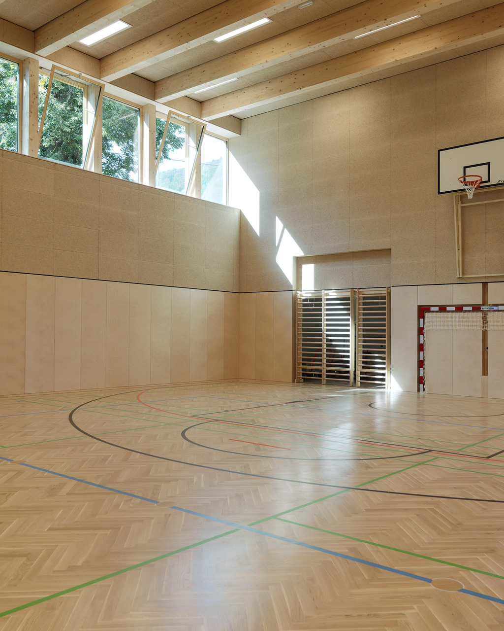 Vielfältige Synergien ergeben sich durch und in diesem Knotenpunkt. So ist etwa der neben dem Eingang liegende Hofladen für regionale Bio-Produkte direkt mit der Küche verbunden, und auch dessen Wechselspiel mit dem freitags am Vorplatz stattfindenden öffentlichen Bauernmarkt funktioniert gut. Innen erlauben Schiebewände Verbindung oder Separierung zwischen dem zum Turnen oder für Veranstaltungen genutzten Mehrzwecksaal, Seminarraum und Speiseraum.