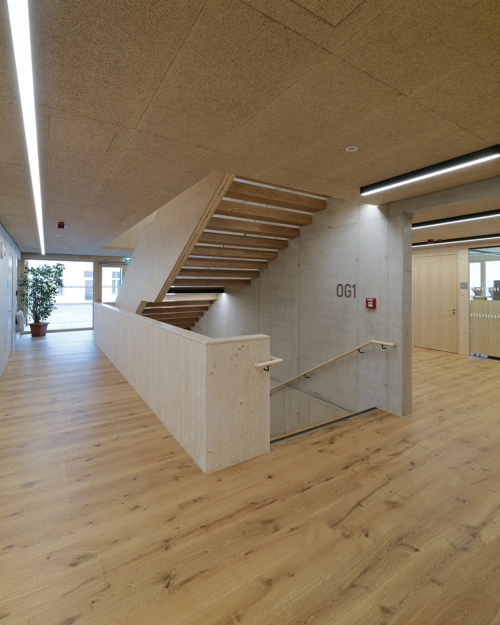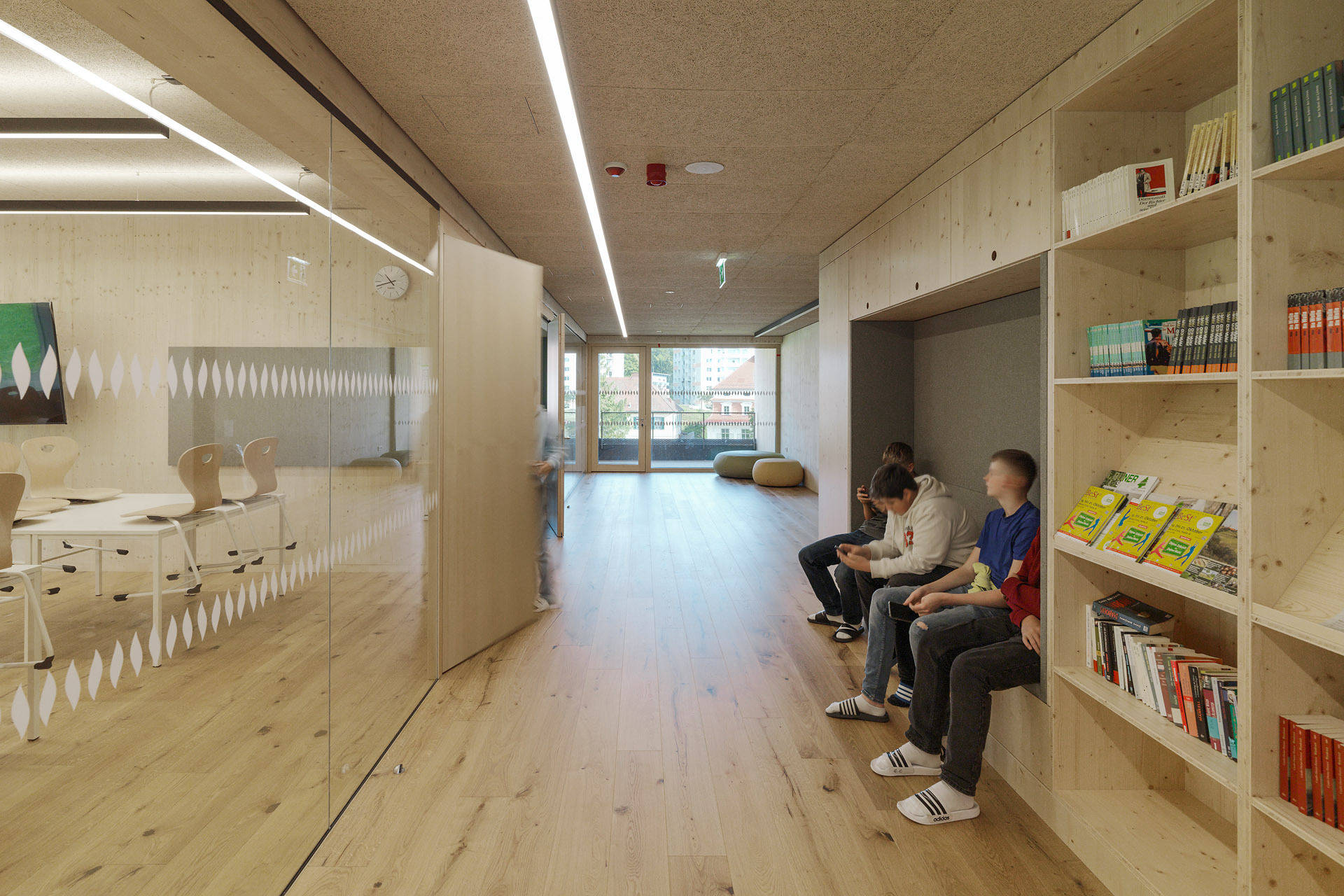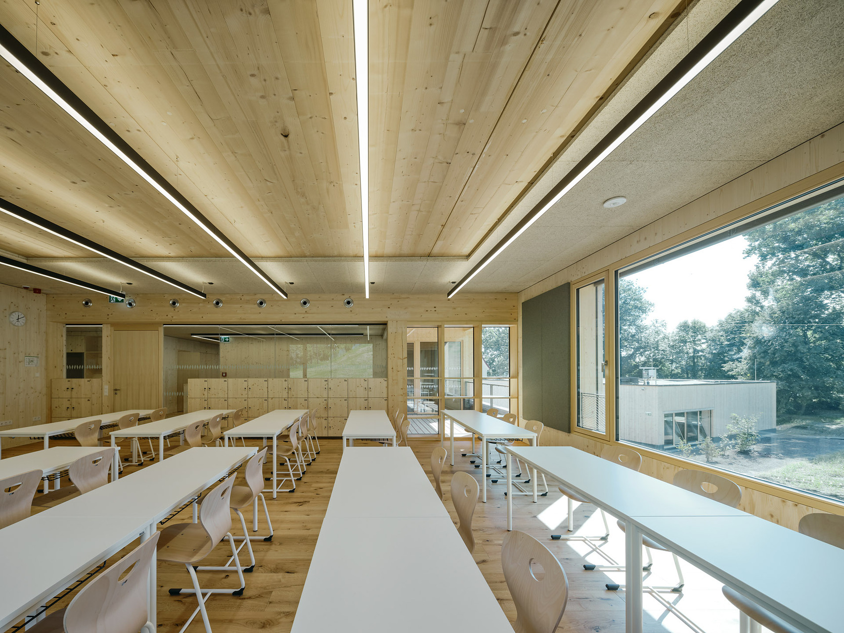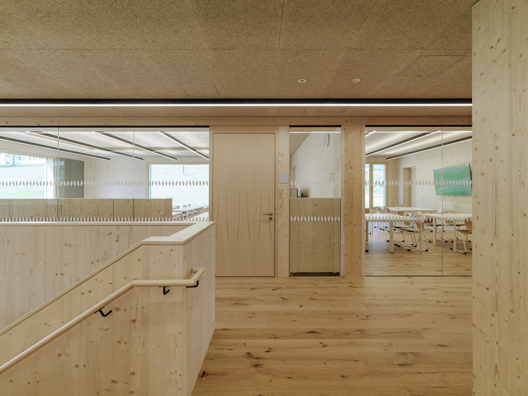 Um Erschließung und Sanitäreinheiten liegt ein durchgängiger Ring aus verschiedenen Aufenthaltsflächen, dahinter sind an der Außenwand die Klassen- und Gruppenräume, Direktion, Verwaltung und ein großes gemeinsames Arbeitszimmer mit zwei kleinen „Ausweichbüros“ für die Pädagog:innen übersichtlich aufgefädelt. Wie Bilderrahmen für die Landschaft (samt grasenden Kühen) lenken überall riesige Fenster den Blick in die Natur, die hier ja als relevanter Pädagoge im Fokus steht.