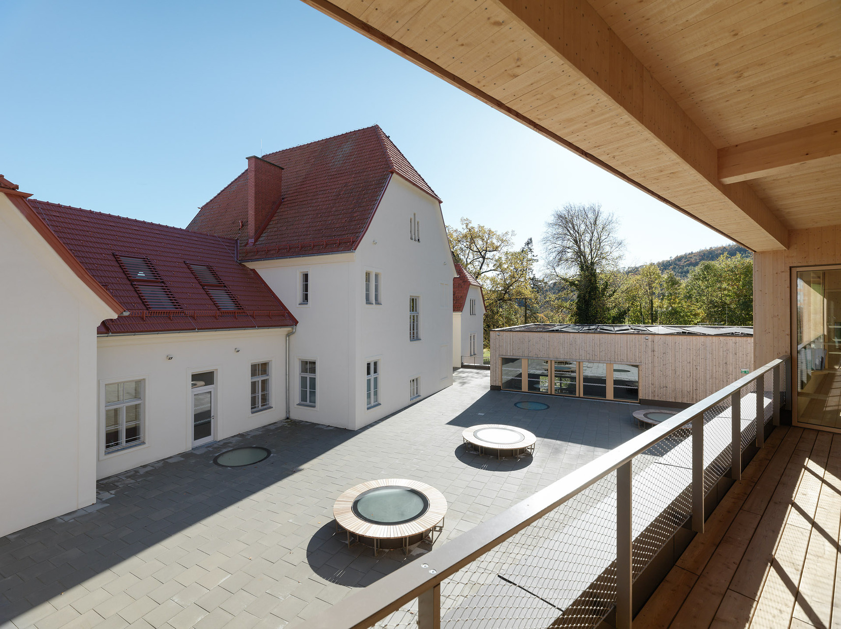 Von hier aus überblickt man auch jene Kerbe, die sich aufgrund der Hanglage zwischen den beiden neuen Baukörpern bis zur Terrasse des Speisesaales neigt, von der aus aber auch die Dachterrasse erschlossen werden kann. Auch wenn die Bepflanzung erst anwachsen muss, zeigt dieser kleine intime Hof mit seiner spannenden Durchwegung schon die Vielschichtigkeit dieses Gebäudes.