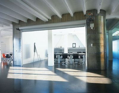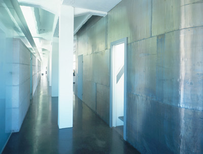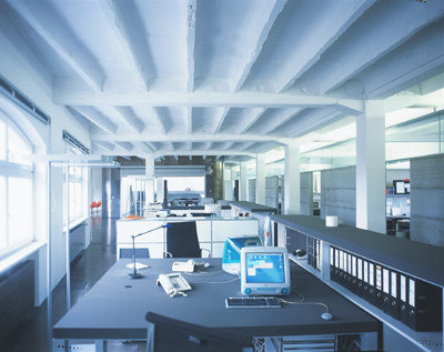 Vor dieser omnispräsenten Natur-Kulisse ein urbanes, den vorgefundenen Industriecharakter weiterspielendes Bürokonzept zu entwickeln, erwies sich als richtiger Weg für das Selbstverständnis der Agentur. Ein homogener Estrich überzieht die gesamte Nutzfläche des Unternehmens, das - von einigen Zellenbüros und dem Besprechungsraum angesehen - eine offene Struktur anstrebte. Trennwände aus Ortbeton, dazwischen Nurglastüren, dünne Bleiplatten (üblicherweise von Dachdeckern verwendet) bestimmen das nüchterne Oberflächenbild der Räume.