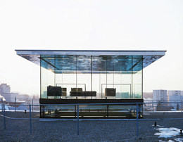 Das Flachdach wurde über dem Besprechungsraum zugunsten eines Think Tanks (selbsttragende Nurglaskonstruktion) geöffnet, in dem „die Kreativen bei kreativem Notstand zur Inspiration verleitet werden sollen“, so der Agenturchef. Diesen priveligierten Ort erklimmt man über steile Treppen, oben steht den nachdenklichen Kreativen ein Sofa bereit. Hier können in aller Ruhe Werbe-Konzepte ersonnen werden, das Bewusstsein für die statische Meisterleistung dieser gläsernen Zelle spielt hierbei selbstverständlich eine untergeordnete Rolle (Text: Gabriele Kaiser)
