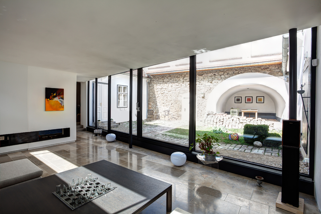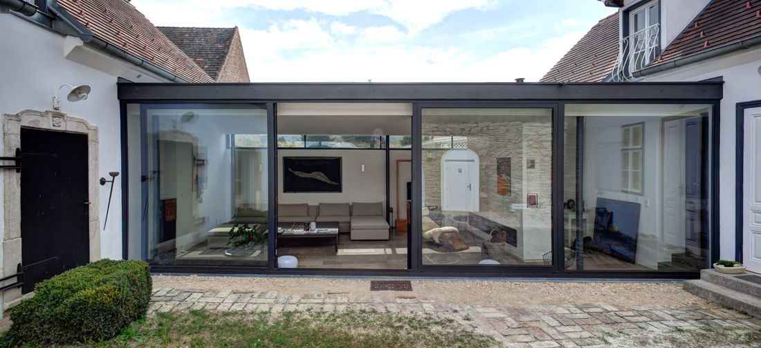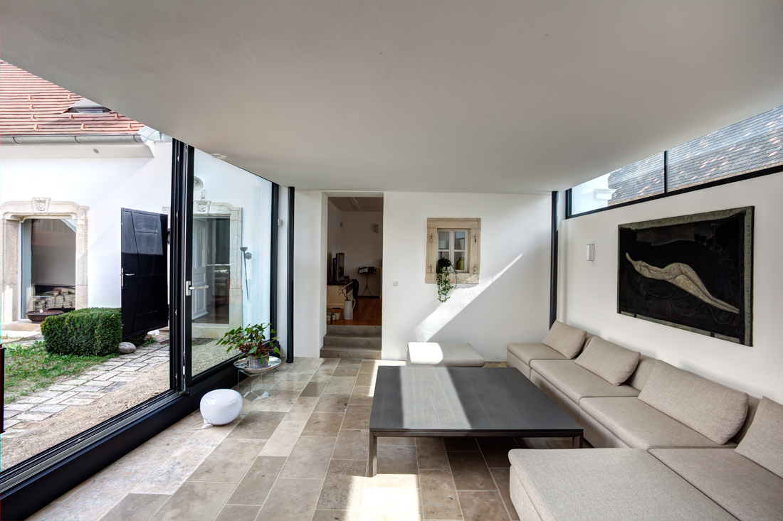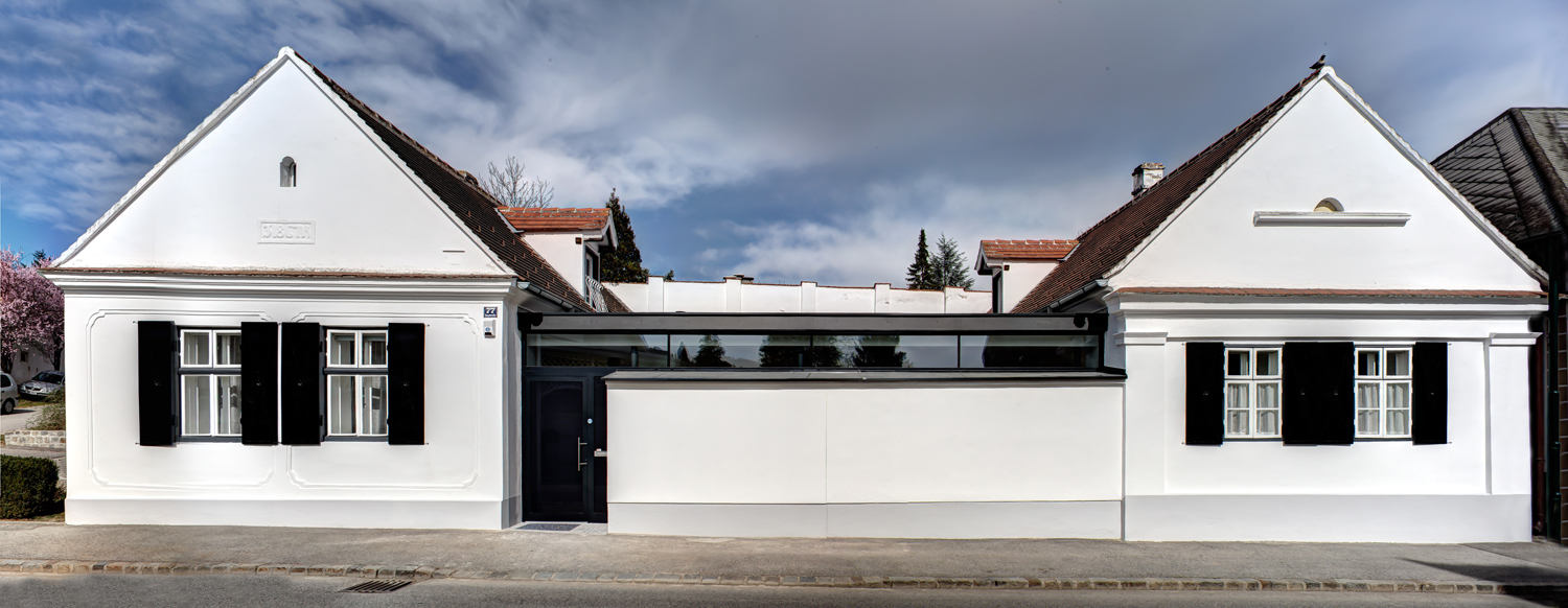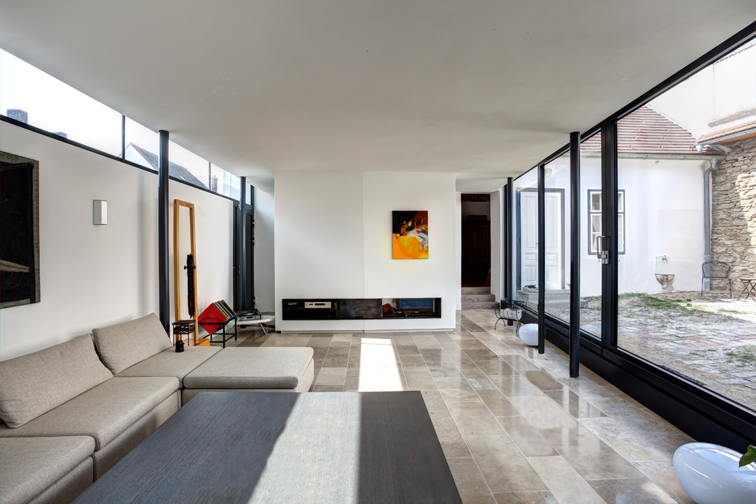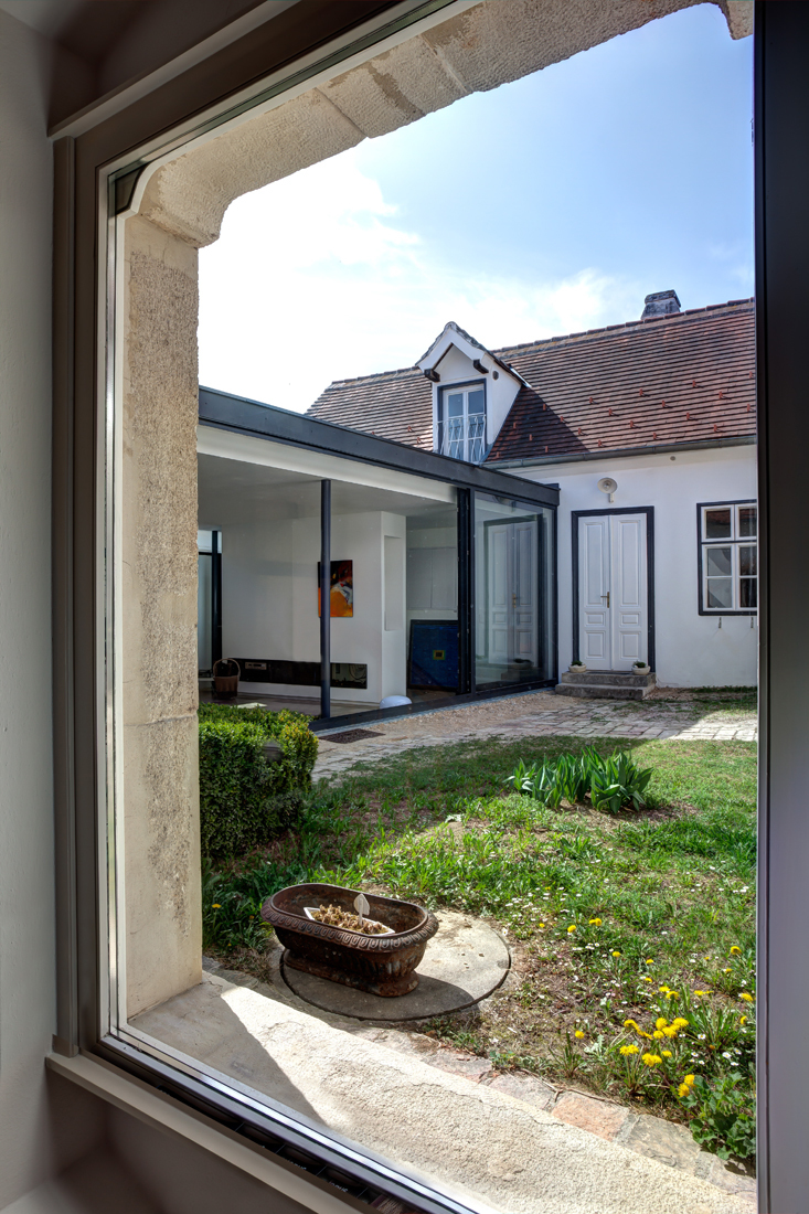 Der behutsame Umgang mit dem Bestand hatte Priorität. Der Neubau hält durchgängig einen Respektabstand zum Vorhandenen, historische Details wie die Natursteineinfassungen der Fenster oder Gesimse werden einbezogen und die Vorzüge von Alt und Neu betonen sich im Kontrast gegenseitig. Neue Öffnungen im Mauerwerk werden als geradlinige Einschnitte gesetzt, und die Fassadengestaltung mit weißem Putz und schwarzen Fensterrahmen wird fortgesetzt.