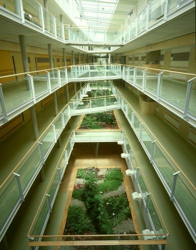 Passionsblumen und Kastanienwein erklimmen problemlos Höhen von 20 m und machen das Segel in kurzer Zeit durchscheinend Grün. Eine lichtdurchlässige Grünskulptur verbindet somit die fünf Geschoße und lässt je nach Betrachterstandpunkt immer wieder neue Figuren (Fadenspannbilder) erkennen.