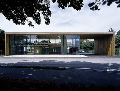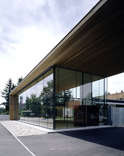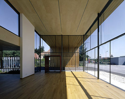Ein schlanker Bügel aus unbehandeltem Zedernholz, der die zweigeschossige gläserne Vitrine des Ausstellungsraums rahmt, verweist in seiner feinen Materialität auf die tischlerische Kompetenz von Lehner/Schölmberger und verschafft der Firma ein großzügig gerahmtes Entree. An die zarte Glasbox grenzt der eingeschossige, lichtdurchflutete Bürobaukörper, in dessen Mitte ein kleiner, ebenfalls verglaster Innenhof von innen her für Durchlässigkeit sorgt. Ein hier gepflanzter Ahornbaum strahlt inmitten von konzentrierter Arbeit oder hektischer Betriebsamkeit natürliche Ruhe aus.