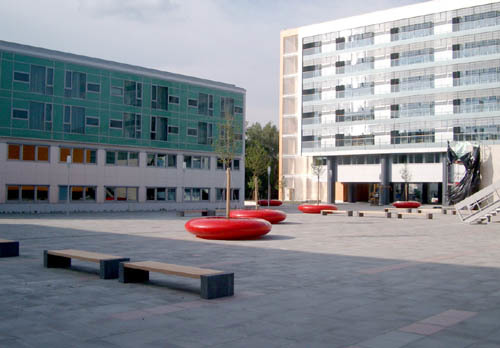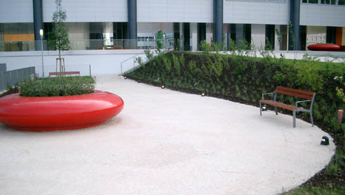 Verwendete Materialien: Sichtbetonmauern, Natur- und Kunssteinbodenbeläge, Wassergebundene Decke, GFK, Mastleuchten und Pollerleuchten, Erd- und Pflanzenmaterial. Wiederkehrendes Gestaltungselement sind „schwebende“ Pflanz- und Sitzskulpturen. Besonderes Augenmerk des Projekts ist klares Design gepaart mit Alltagstauglichkeit. (Text: Markus Beitl)