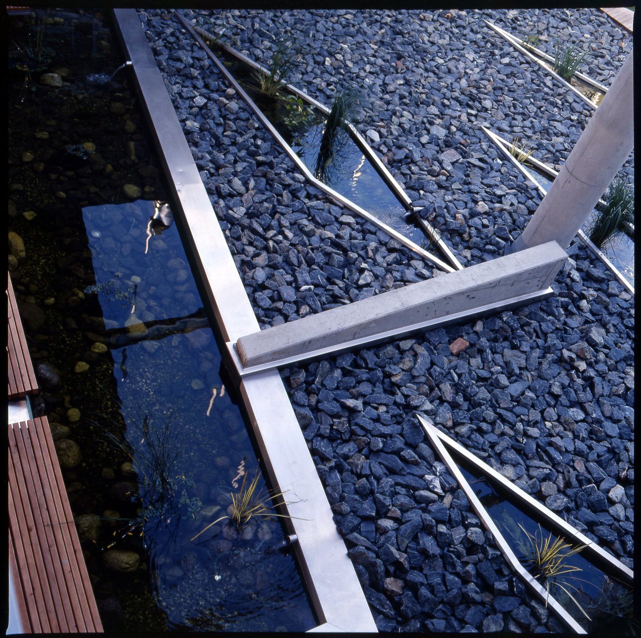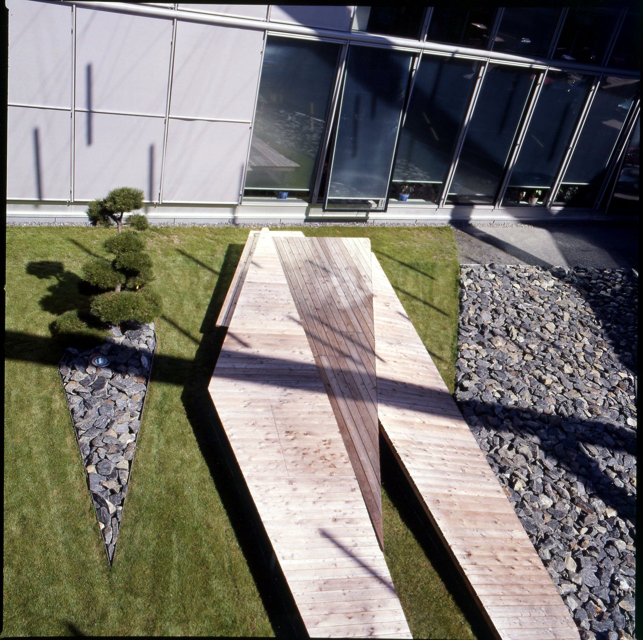 Der Blick schweift über das ansteigende Feld aus Kärtner Amphibolit-Geröll. Kaum hörbar rieselt Wasser durch eingesetzte Schilfbecken, die in ihrer Form und Anordnung mit der Seilüberspannung der Dachkonstruktion korrespondieren. Am höchsten Punkt kippt die Landschaftsszene, ein begehbarer Steg aus Lärche verbindet und trennt, bildet den Übergang zur invers gestalteten Parklandschaft. Eingebettet in eine sanft geneigte Wiesenlandschaft (Fertigrasen) schwimmen amorphe Amphibolitfelder gefasst von Stahlrahmen und bewacht von exotischen Bonsai-Schwarzkiefern.