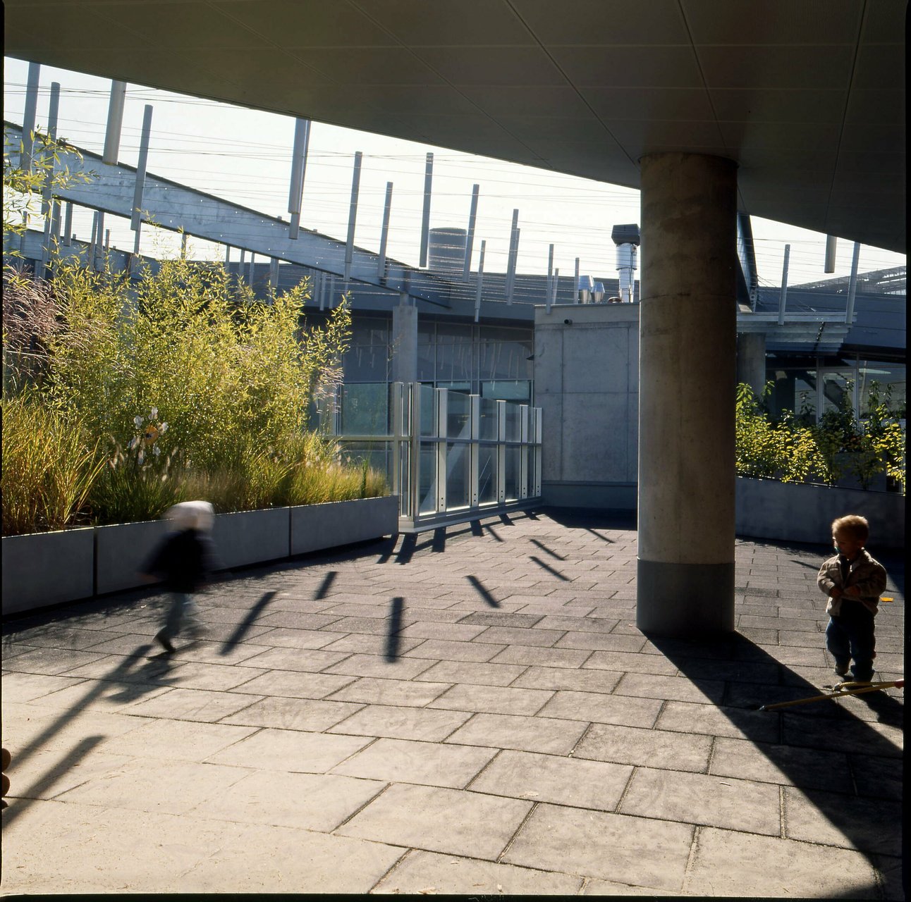 Entsprechend den Bedürfnissen von Kleinkindern entstanden unterschiedlichste Erlebnisbereiche. Ein in Becken gefasster Bambus- und Gräserdschungel dient als Versteck- und Rückzugszone. Felsenbirnen schirmen eine Erzähl- und Spielnische ab, ermöglichen konzentriertes Zuhören und Mit-sich-selbst beschäftigen. Spielwand und Spielplatz fördern Kreativität, Aktivität und Ausgelassenheit.