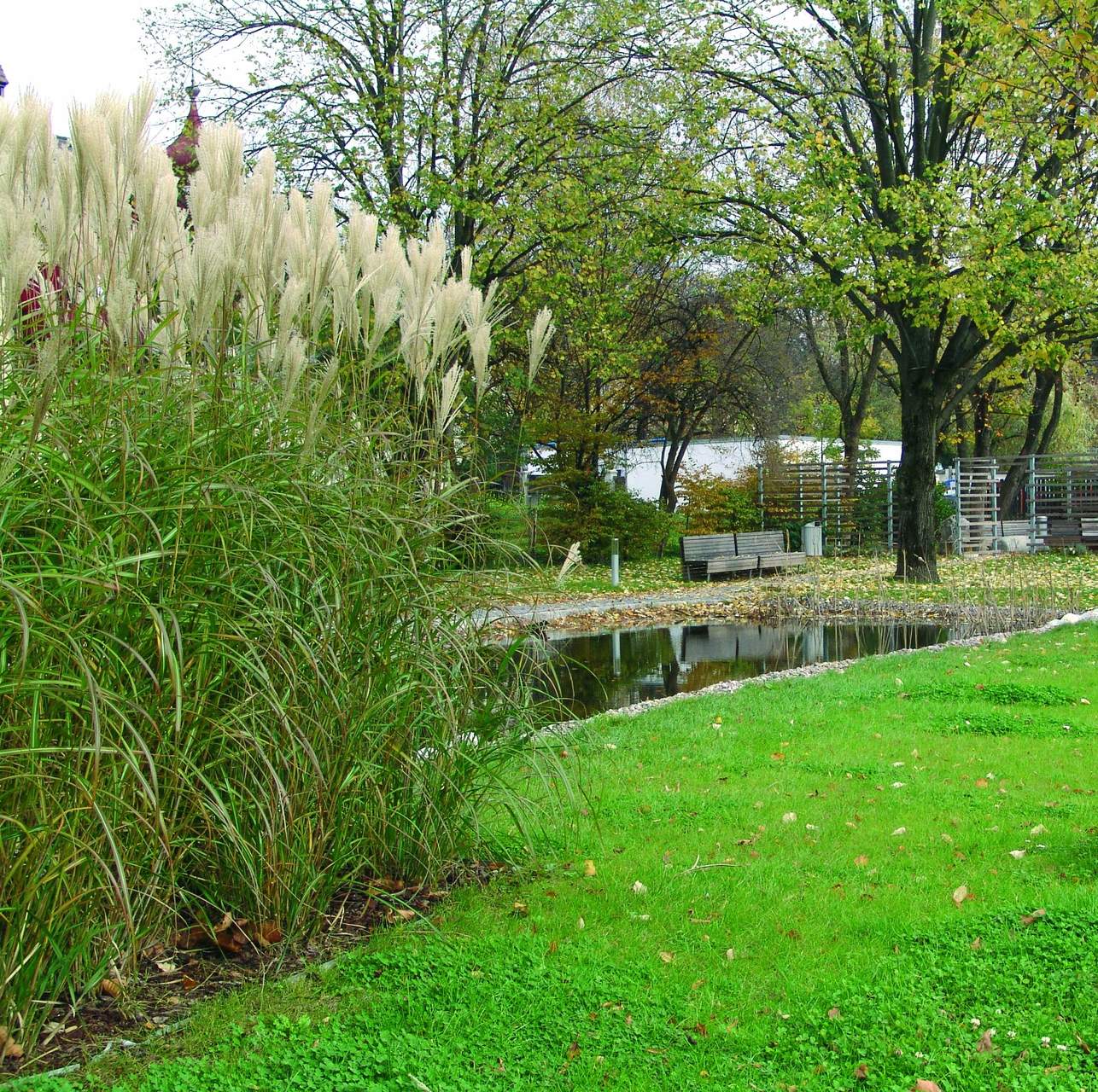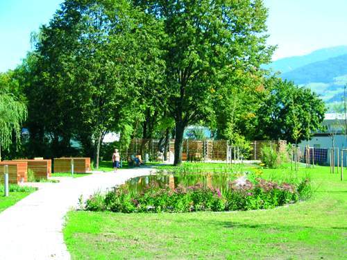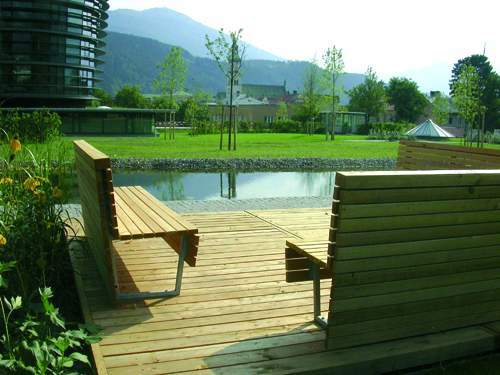 Der Hauptweg in Form einer weitläufigen S-Kurve bündelt die wichtigsten Erschließungen und Zugänge. In leichten Schwingungen versetzte Silberahorne und Vogelkirschen bilden das Grundgerüst, parallele Heckenstreifen aus Viburnum (Schneeball) und Cornus (Hartriegel) fügen einen zweiten Layer hinzu. Um einen Teich im Norden entsteht eine intimere Zone für ortsansässige Besucher; Holzdecks umgeben von Gräsern bieten einen gleichsam öffentlichen Wohnraum. Der tiefer liegende Platz vor dem Kurhaus wurde nach beiden Seiten zu den Arkaden hin geöffnet und ebenerdig zugänglich gemacht.