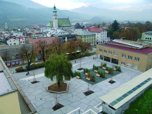 Große vor Ort betonierte polygonale Felder mit breiten Kiesfugen bestimmen die Platzfläche, in der neben der alten Trauerweide Silberahorne stehen und in die ein Bambusgarten eingelagert ist.