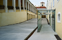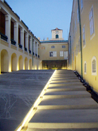 Die Ausmaße des Hofs betragen 60 m x 8 m bei einem Niveauunterschied von 2,5 m entlang der Längsseite. Um die räumliche Qualität der historischen Gebäudesubstanz noch besser herauszustreichen, entschlossen wir uns, dem Bauherren eine monochrom-dynamische Ebene mit einer monolithischen Oberfläche vorzuschlagen. Diese monolithische Platte aus Beton liegt 20cm erhaben und mit Abstand zu den angrenzenden Fassaden im Hof. Dieser Höhensprung nimmt auch die Beleuchtung auf, sodass die Ebene bei Dunkelheit förmlich zu schweben scheint. Entlang der Ostseite und im Bereich des stärksten Rampengefälles befindet sich als „Abdruck“ in der Platte eine breite Podesttreppe, die den Besucher zum Eingang des Verwaltungsgebäudes führt. An den Stirnseiten des Hofes wird die monolithische Platte mit berankten Paravents abgeschlossen, die mit dichter Bepflanzung aus Ramblerrosen, Waldrebe, Trompetenblume und Geißblatt fette grüne Akzente setzen.