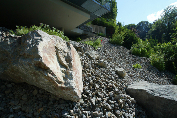 Die Geröllhalde ist beidseitig von Weidenflaum gesäumt. Zur Schuttrinne hin wachsen alpine Zwergweiden, gegen die Grundstücksgrenze hin sind höhere Weidenarten, Hartriegel und Schneeball gesetzt. Diese Gehölze festigen den Steilhang und werden durch Hangwasser versorgt.