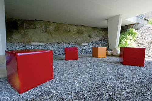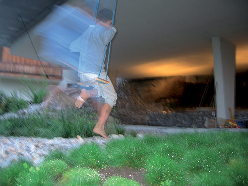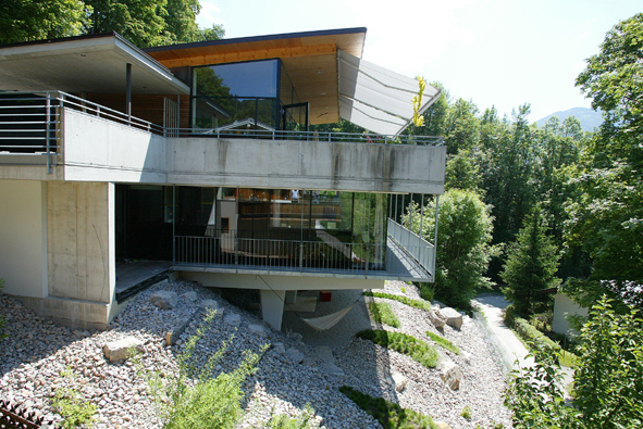 Unter dem Haus wurde durch Tieferlegung und Rundkies-schüttung ein gemütlicher, ebener Raum geschaffen. Er ist ein Rückzug an heissen oder verregneten Tagen und einfach zum Spielen. Hellgrüne Farne und rote Sitzwürfel setzen Akzente. Lichtspots lassen das Haus nächtens schweben. (Text: Neubert & Fuchs)
