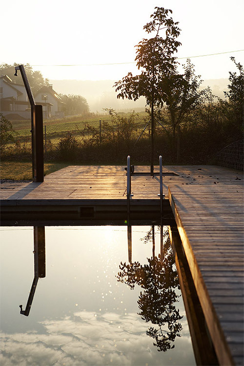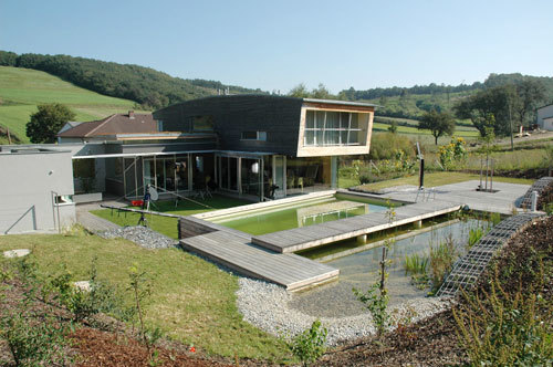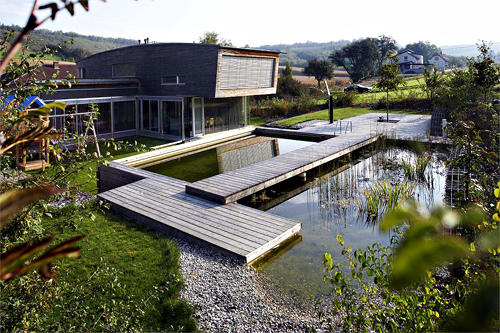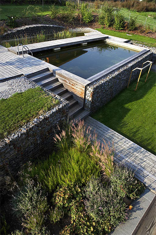 Die Pergola im Hof führt wieder direkt in die Küche, wo die Mutter ihre Kinder in Wohnraum, Garten oder Wasser stets im Auge hat. Hinterm Biotop klettern Gabionen im Drahtgitter den Hügel hoch. „Zwischen den Steinen nisten Eidechsen und Molche, der Garten ist so bepflanzt, dass die Vögel leicht fündig werden“, freut man sich. Lediglich bei den Himbeeren entfacht ein regelrechter Kampf zwischen Tier und Mensch.