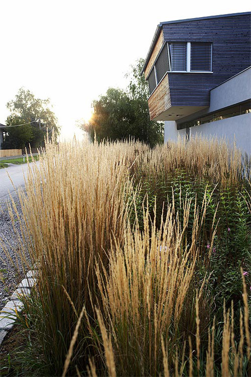 Mitsamt seinem malerischen Biotop wird der Garten nun von einem u-förmigen Hofhaus umfasst. Im Obergeschoß ist der lang gestreckte Riegel von einem sachten Dachbogen bespannt. Er ist mit horizontalen Lärchenlatten verkleidet und erweist so den nachbarlichen Stadeln eine feine Referenz. Keck lugt sein auskragendes Nordende zwischen den Bäumen auf die Straße.