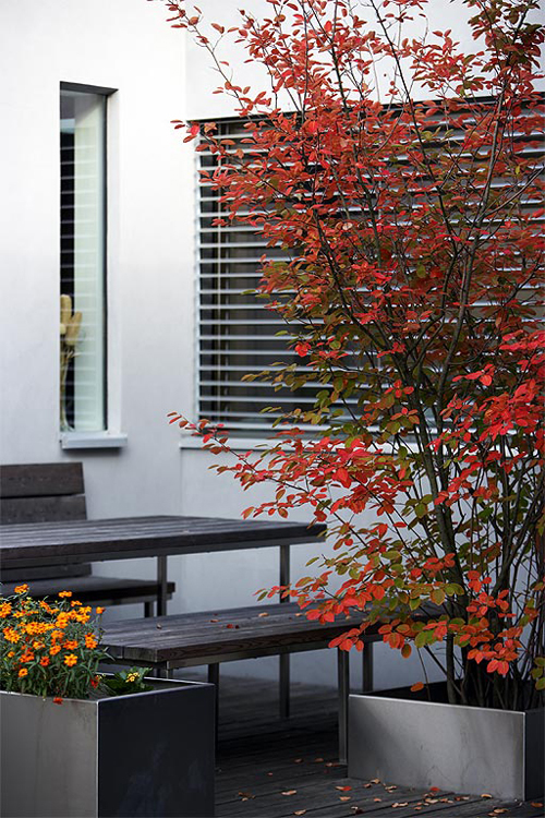 Der Bauherr ist leidenschaftlicher Handwerker und technischer Perfektionist. Das BUS-System, das die Sonnensegel und Jalousien des Niedrigenergiehauses je nach Wind und Wetter sowie die gesamte Beleuchtung und den Medienraum steuert, verlegte der Bauherr selbst. Daheim arbeitet er bei Frau und Kindern, jedes davon hat seinen eigenen PC an der langen Workstation. Diese liegt am lauschigen, windgeschützten Innenhof mit Aussicht auf einen Birnbaum.