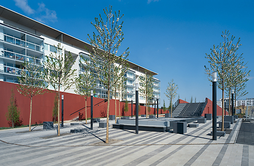 Die Abfolge von Plätzen und Promeniermeile lädt zum Verweilen und Flanieren ein. Schattenspendende Zierkirschenhaine überstellen die Plätze, spiegelnde Wasserflächen schaffen ein repräsentatives Entree zur angrenzenden Shopping - Mall und bieten einen idealen Ort zum Lunch- und Shopping Break sowie Verweilen im Außenraum. Sämtliche Plätze werden thematisch unterschiedlich geprägt. Mit einem Raster aus Baumstämmen überstellt, mit eleganten Holzsitzbänken bestückt, als Wasserplatz mit dem Reflexionsbecken ausgebildet, als Kinderspielplatz den jungen Generationen überlassend, bildet jeder Platz seinen eigenen Charakter für Jung und Alt.