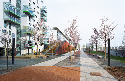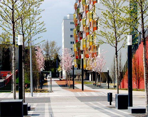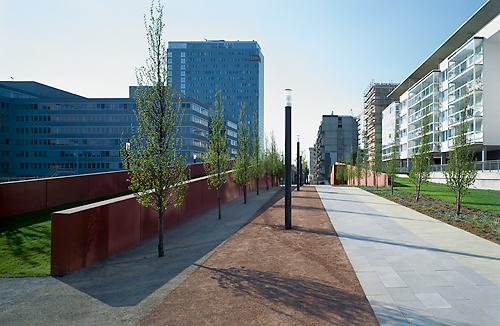 Als zusätzlicher Aspekt ist der Blick von oben, sowohl von den Bürohäusern, wie den Wohnbauten zu nennen, der durch die Rasenrampen einen starken grafischen, grünen Eindruck vermittelt. Die Linearität und der Wechsel zwischen grünen und befestigten Bändern in Farbe und Struktur und vor allen Dingen die unterschiedlichen, abwechselnd aufeinander folgenden rosa und weißblühenden Zierkirschenhaine, die die Platzflächen im Frühsommer in Farbe tauchen, geben dem Park seinen unverwechselbaren Charakter.