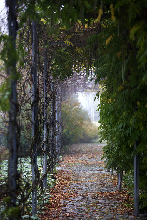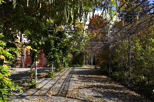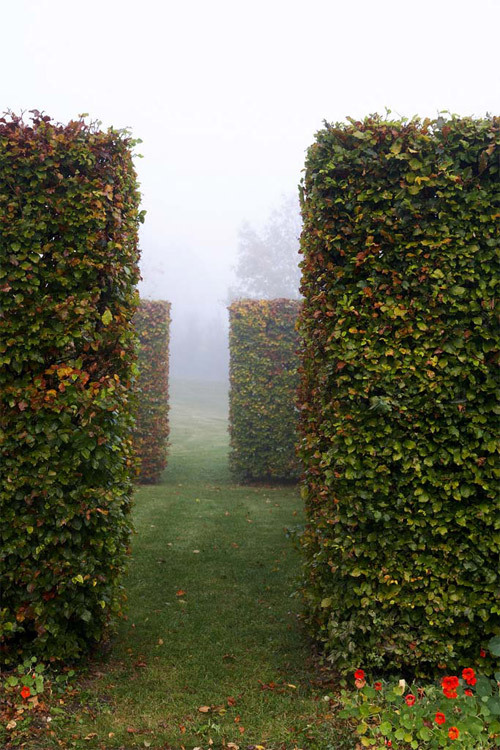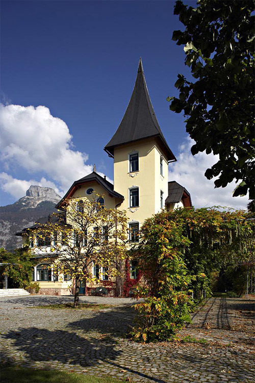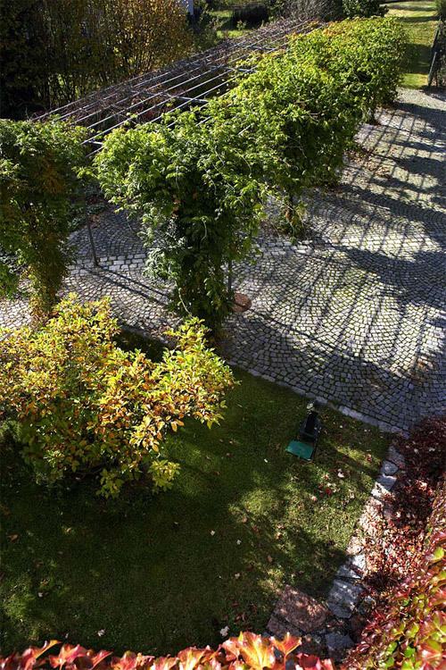 Das Gartenzimmer aus 2,5 m hohen Rotbuchen, das auf einer Fläche von 16 m² nur den Blick auf die höchsten Berge und den Himmel freigibt oder den langen Gang, der – aus filigranem Formrohr – üppig mit wildem Wein und Glyzinie berankt, das wichtige Gelenk zwischen Piazza, Waldgarten und neuer Terrasse bildet.