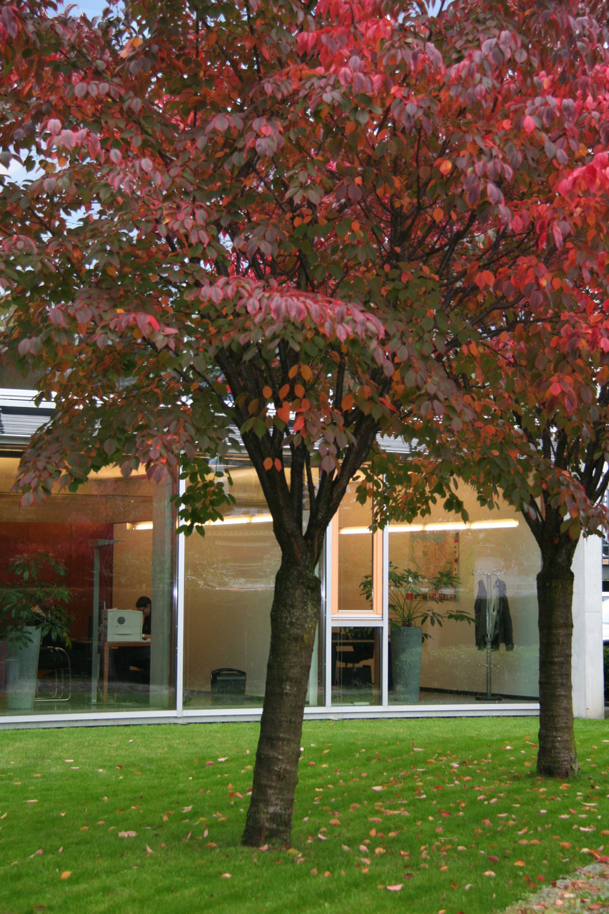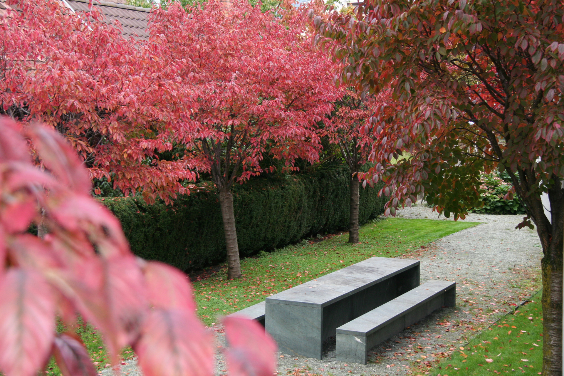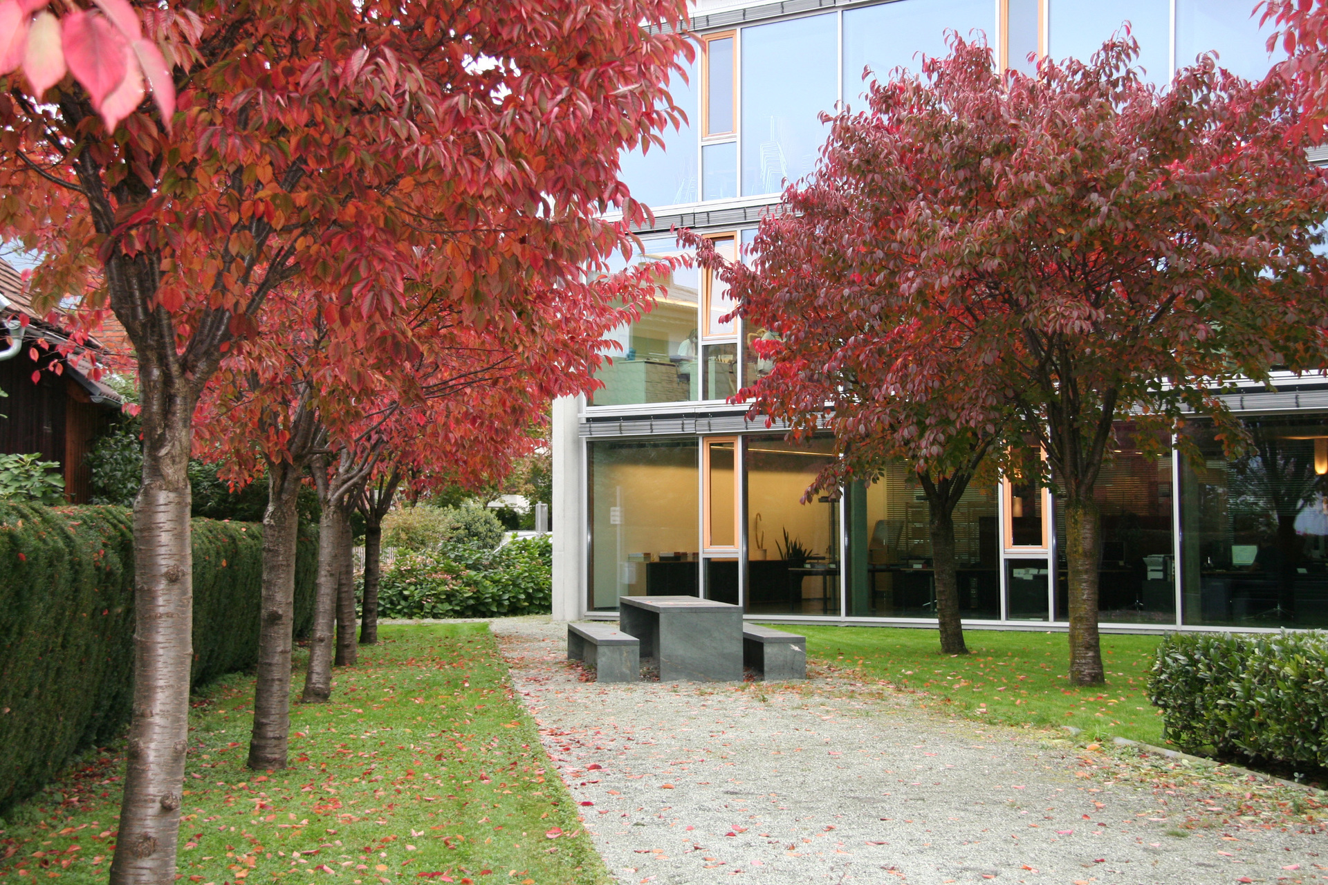 Weiters gelang es der Landschaftsplanerin dem dreiecksförmigen Innenhof eine Größe zu verleihen, die er gar nicht hat und poetische Zonen zu schaffen: eine Efeuwand mit Glyzinien wie Schaum zuoberst, eine Eiben- vor eine Bestands- Thujenhecke, eine Kirsch – Allee, in deren blühende Baumkronen der Patient von seinem Behandlungsstuhl aus blickt. Ein monolithischer Natursteintisch und ebensolche Bänke schaffen skulptural- wirksame, funktionale Möblierung- dies wiederum vom Architekten gestaltet und unter Verwendung desselben Natursteines, der bei allen Fußböden des Bauwerkes verwendet wurde: Tiroler Dorfergrün.