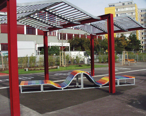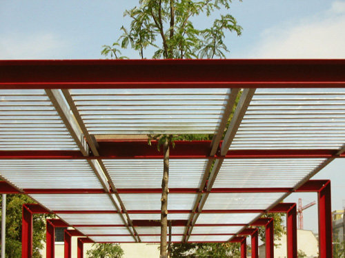 Die Gestaltung thematisiert die Bauraster der Umgebung: Rechteckige Plätze greifen ineinander und werden durch niedrige Heckenblocks getrennt. Markante rote Pergolen signalisieren Treffpunkte und bieten dringend notwendigen Schatten. Der orthogonale Oberflächenraster wird von einem lockeren Baumschleier überspannt, der sich aus abwechselnden Zügen jeweils großblättriger oder kleinblättriger Bäume zusammensetzt.