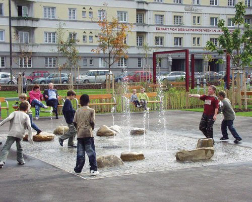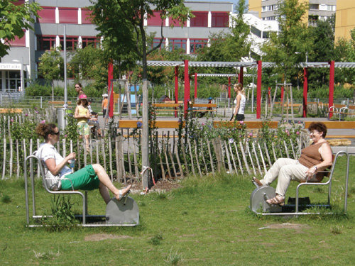 Ist der Park intensiv genutzt treffen sich die Generationen in ihren Bereichen. Für die im Tages- und Jahresverlauf wechselnde Besucherstruktur bieten jedoch alle Parkbereiche Möglichkeiten und regen zum Nutzer-Crossover an. So ist auf der Fitnesswiese unmittelbar neben Boccia und Spieltischen eine Auswahl an Fitnessgeräten für Erwachsene angeordnet. Sie sollen zu spontaner Bewegung im Rahmen der alltäglichen Wege anregen, in die der Park durch Eckerschließung und diagonale Querungen eingebunden wird. Der Wasserplatz mit unregelmäßig gesteuerten Fontänen ist Brunnen und Spielplatz zugleich.