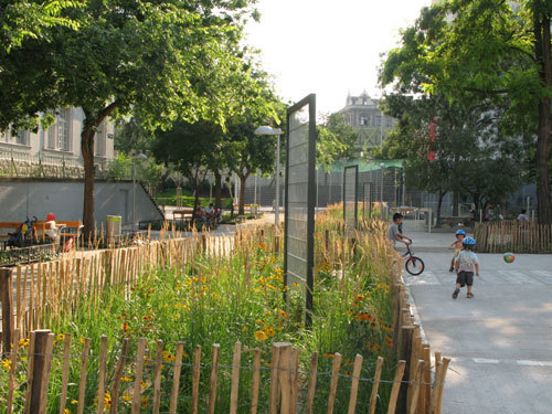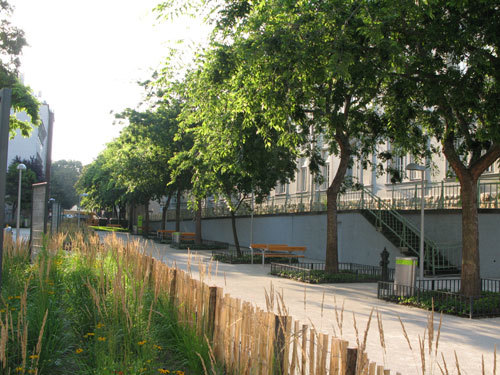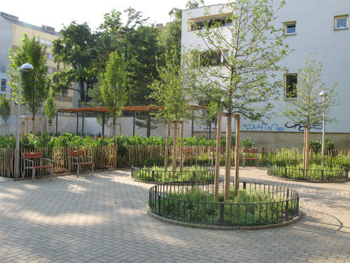 Durch einen bewusstes Eingehen auf die Schichten - Straßenräume, Park der 1980er Jahre und neuer Park - bleibt die Entwicklung des Freiraums nachvollziehbar. Materialien und Formen der 1980er Jahre werden als Kontrast zu den neuen Elementen wiederhergestellt. Eine neue Qualität des Parks ist die Ablösung der alten kleinteiligen Raumstruktur durch offene Achsen auf den ehemaligen Straßenräumen, die nun scheinbar aus dem Park hinaus bis jenseits des Gürtels reichen.