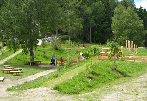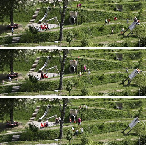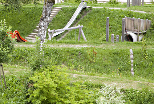 Die neu gestaltete „Spiel-Topographie“ verschafft Ein- und Überblick in jenen Bereichen, die mit Spielausstattung für kleinere Kinder geplant wurden. Jene für ältere Kinder weisen hingegen Versteckräume auf, die durch die Geländemodellierung und Bepflanzung unterstützt werden. (Text: 3:0 Landschaftsarchitektur)