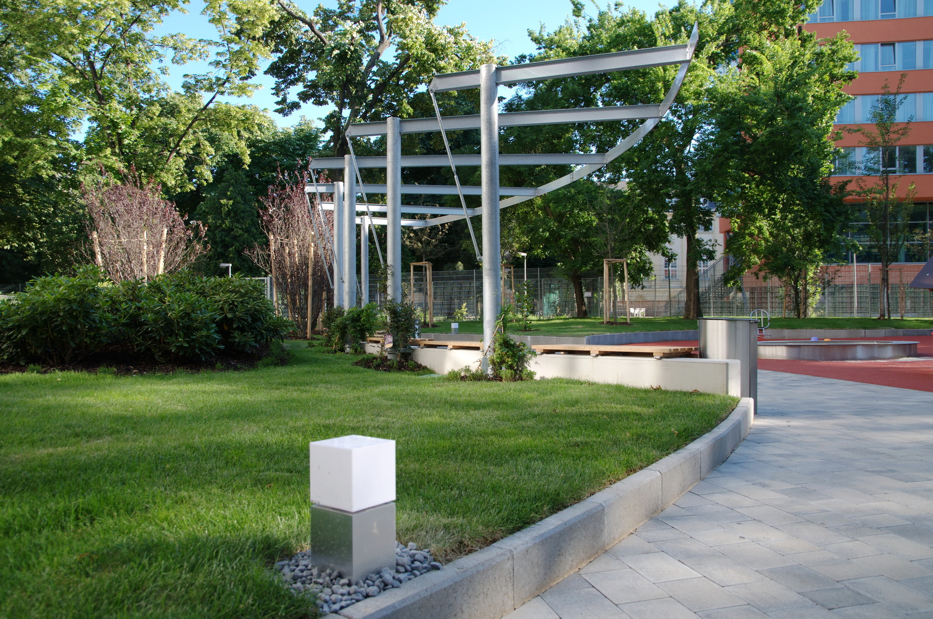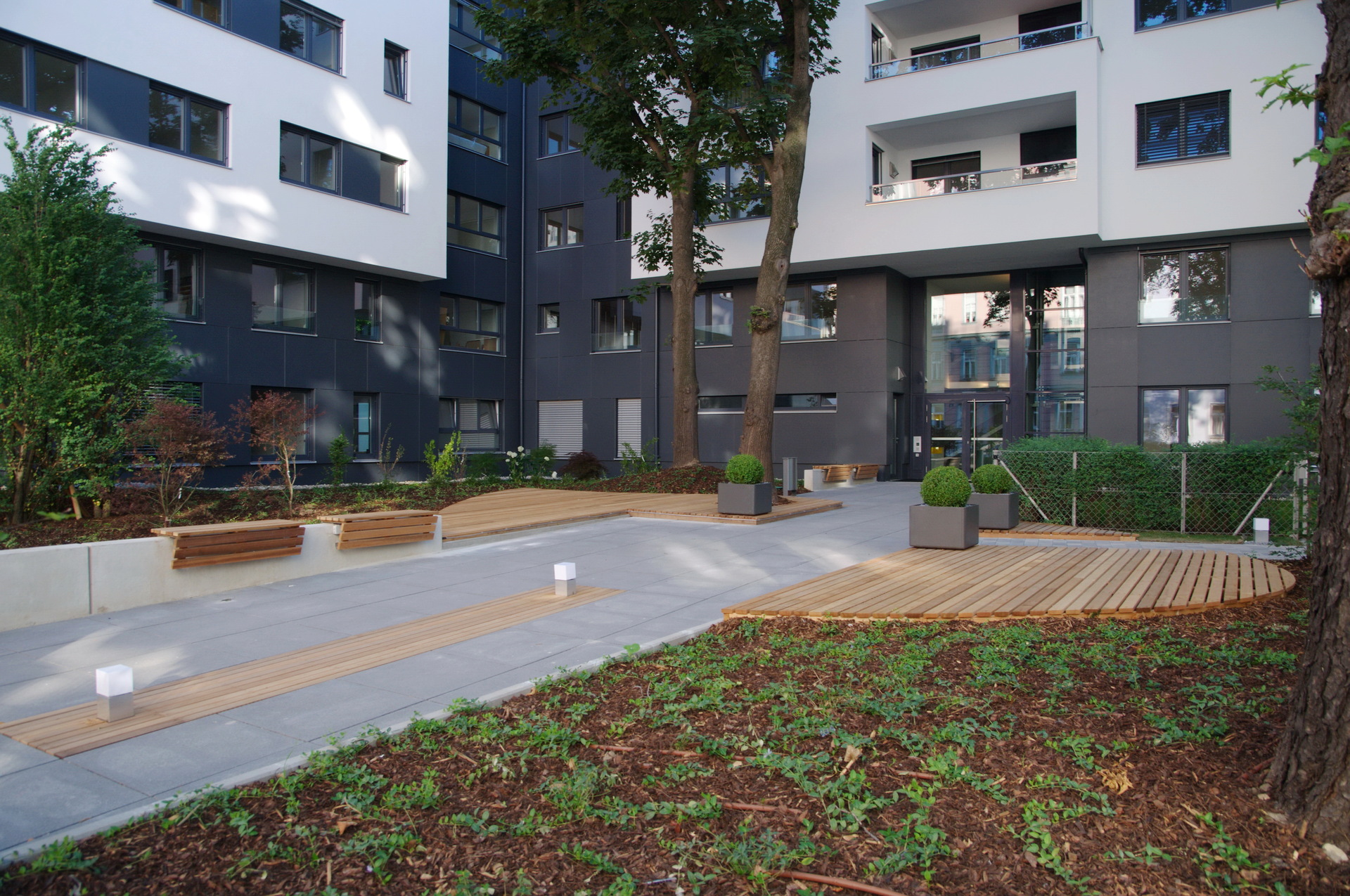Der 3.550m² große Freiraum wurde – entsprechend der Geschichte des Kaisergartens – in die Planung miteinbezogen. Für die Gestaltung der Außenanlagen zeichnet das Planungsbüro Knollconsult ZT GmbH verantwortlich. Passend zur schnörkellosen Architektur bietet der Außenraum geome¬trische Formen, großformatigen Steinplatten und sparsame Bepflanzung mit „asiatischem“ Touch. (Text Architekten, redaktionell überarbeitet Martina Frühwirth)