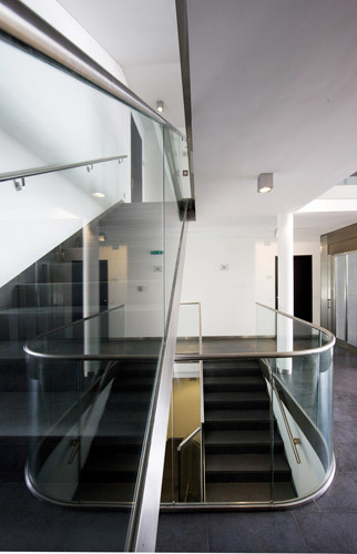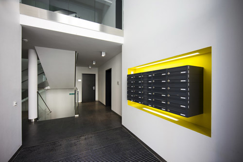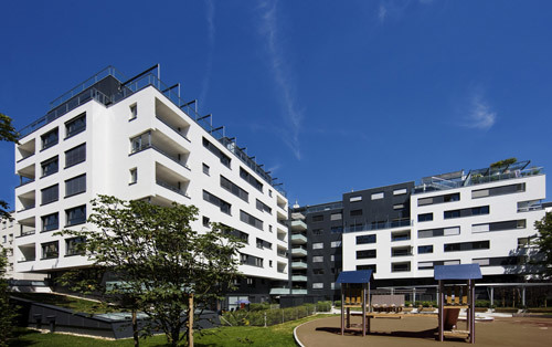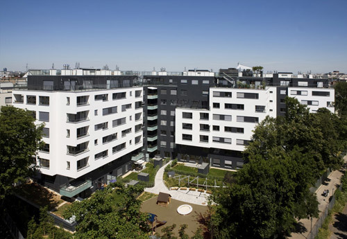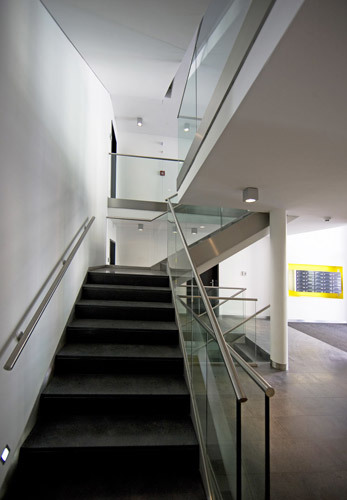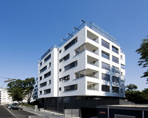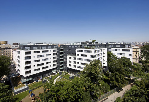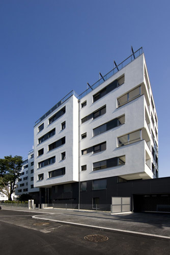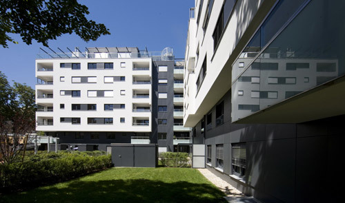 Wesentliches Gestaltungselement ist die Gliederung in drei stadtvillen-ähnliche Baukörper, die baulich zwar miteinander ver¬bunden sind, gestalterisch jedoch durch hochwertige Material¬auswahl getrennt wirken. Gliederungselemente im Detail sind die verglasten Eingangs¬bereiche und Stiegenhäuser, die materialbetonte Ausführung der zweigeschossigen Sockelzone und die farbliche Differenzierung der Dachzone. Im gesamten halböffentlichen Bereich (Eingangszone, Briefkastenanlagen, Stiegen und Lifte) dominieren Glas, Stein und Edelstahl.