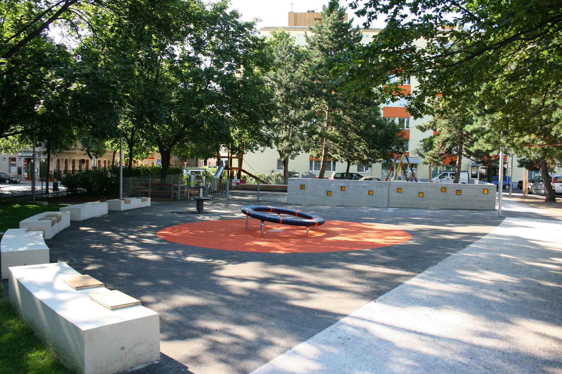 Die südliche Wegkreuzung weitet sich zu einer Platzfläche, zu einem Treffpunkt und Ort zum Abhängen, insbesondere für Kinder und Jugendliche.