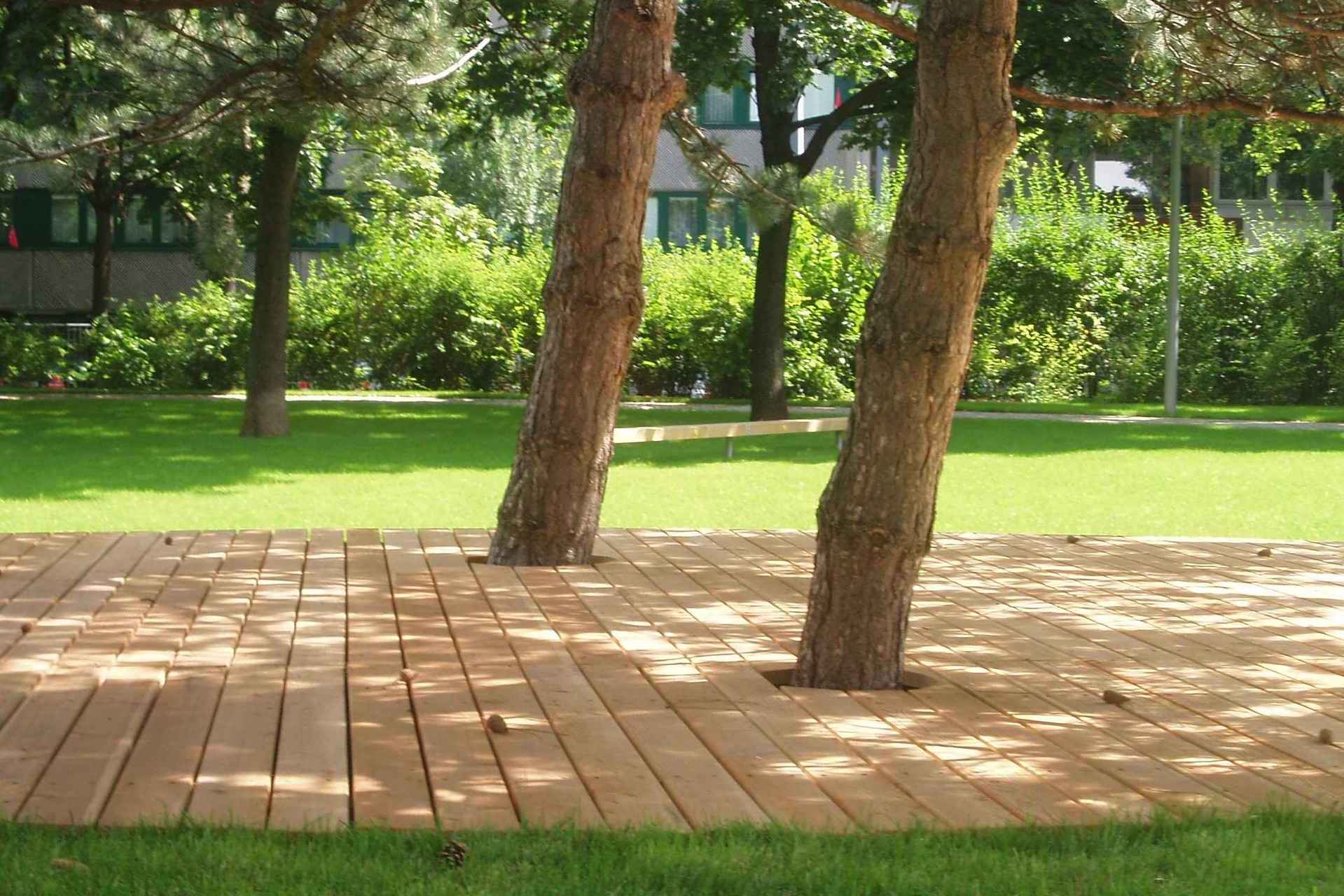 Demgegenüber steht eine zentrale offene Wiesenfläche, die durch eine an eine Rasenwelle angelehnte, ovale Holzplattform unter einer bestehenden Föhrengruppe einen spezifischen Aufenthaltsort bietet.