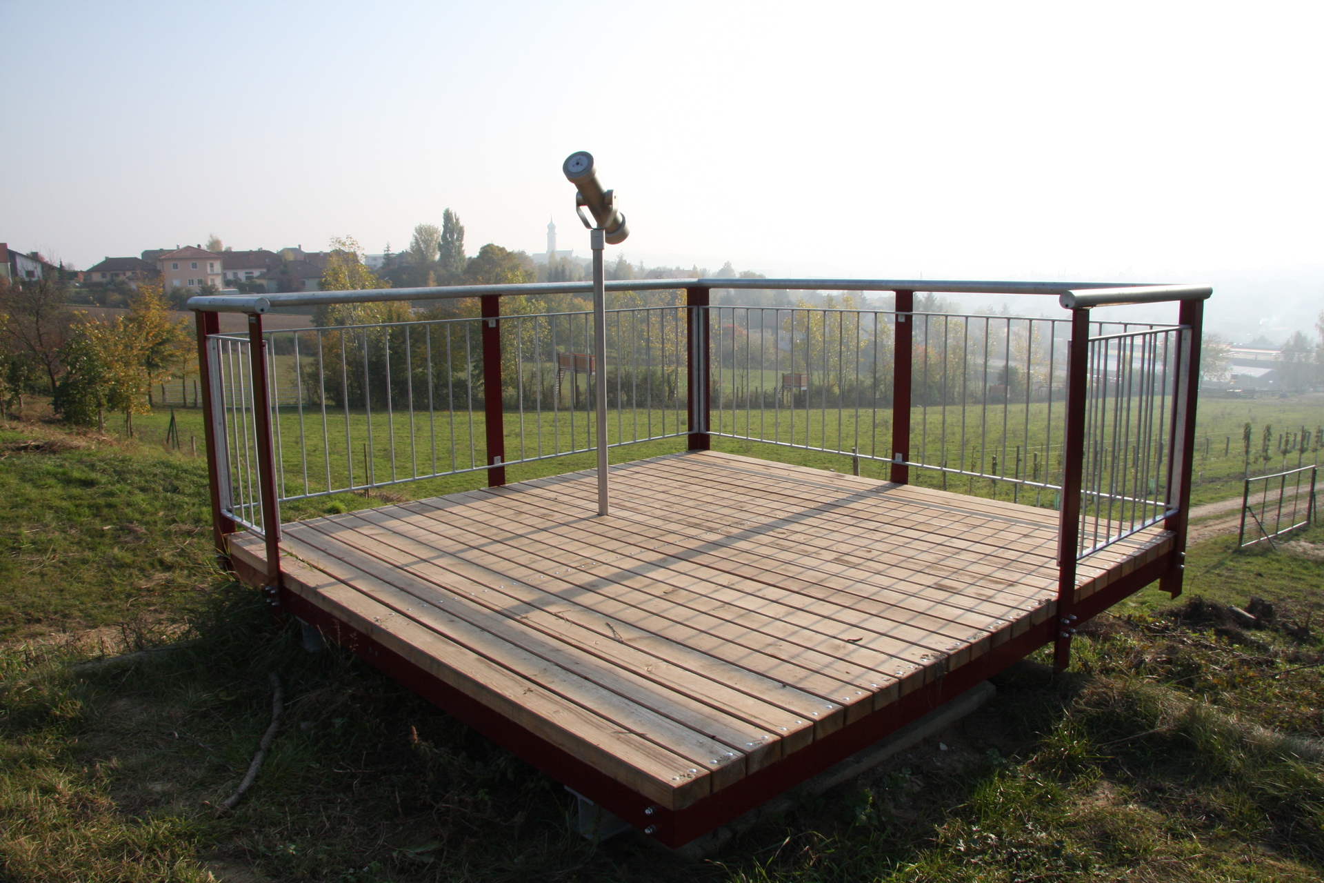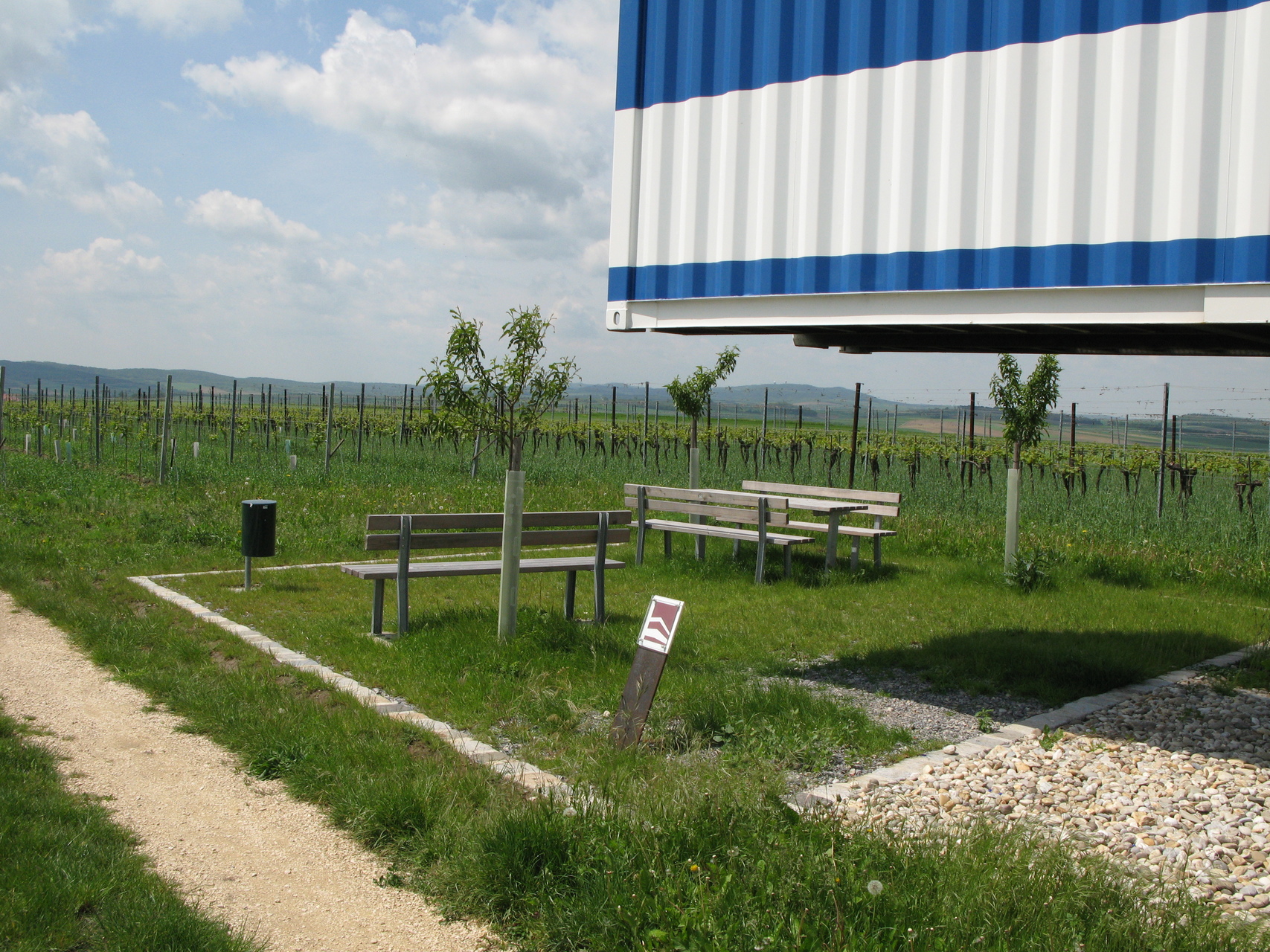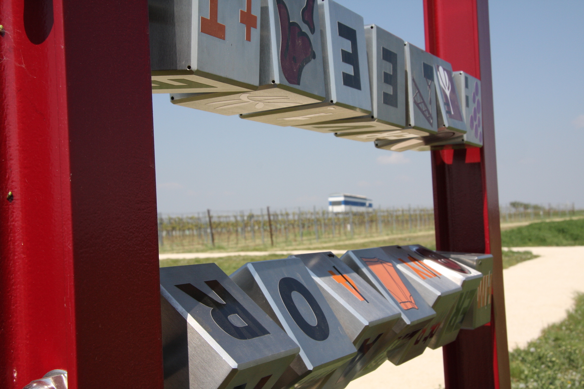 Ein Laubengang aus toten und lebenden Reben verweist auf den sterbenden und auferstehenden Gott, eine Andeutung von Schlachttier und Opfertier erfolgt mit einem Durchgang durch die Schweinehaltung. Ansitze in einer Hecke verbildlichen das Durchbrechen von Grenzen und Gewinnen neuer Sichten. Masken, die zwischen den Reben auftauchen, waren Zeichen der Anwesenheit Gottes und verweisen auf den Ursprung der Tragödie. Ein Drehwürfelrebus im Weingarten bezieht sich auf die Rätsel im Dionysos-Kult. Weinberankte Föhren sprechen den Ursprungsmythos des Weines an. Das Thema Rausch wird als gebrochene Wahrnehmung durch ein Oktoskop und als Schwerelosigkeit auf einer überdimensionalen Schaukel interpretiert. Die bei Kindern wie bei Erwachsenen gleichermaßen beliebte Schaukel bedeutet auch die Überwindung der Grenzen des Alters. Purpurrot als Leitfarbe des Weges ist von einer antiken Dionysiosfigur abgeleitet. Bildsymbole anstelle apollinischer Texttafeln bilden das Leitsystem.